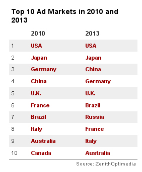 Самый большие успехи ждут Китай, Россию и Бразилию. По данным ZenithOptimedia, Китай сможет обогнать Германию и стать третьей по величине страной по объему рекламного рынка в мире к 2013 году, сразу за Японией. Бразилия, займет шестое место, обогнав Францию, а Россия поднимется с 12 на 10-е место. К 2013 году ZenithOptimedia также прогнозирует, что телевидение будет составлять около 41,7% от всех рекламных расходов. |