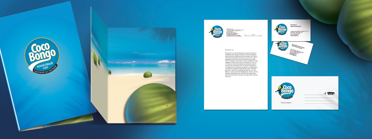Выразительный логотип, такой же сочный, как кокосовое молоко, отлично смотрится на визитках, конвертах и в фирменной документации.