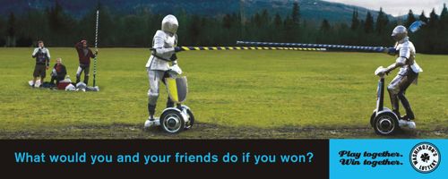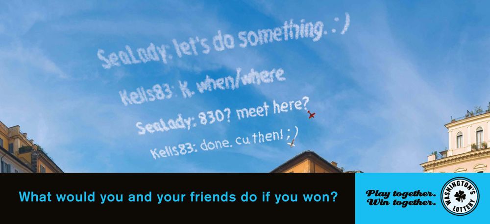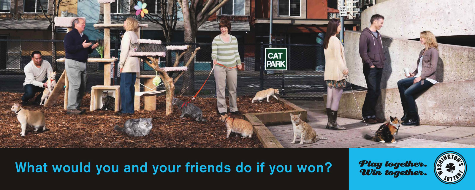 Washington's Lottery учит, как пользоваться выигранными деньгамиВ рекламной кампании отразили причуды внезапно разбогатевших людейАмериканское агентство Cole&Weber United разработало наружную рекламу для лотереи Washington's Lottery. Баннеры изображают довольно эксцентричные сценки из жизни богачей, например: создание специального парка для выгула кошек, рыцарский турнир на сегвеях и переписка с помощью инверсионных следов двух самолетов. Демонстрируя все это, реклама обращается к зрителям с вопросом, чем займутся они и их друзья, в случае выигрыша в лотерею, тем самым привлекая их и к самой покупке лотерейного билета. Состав творческой группы |