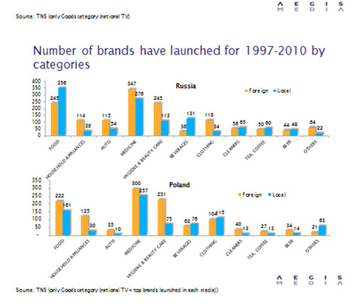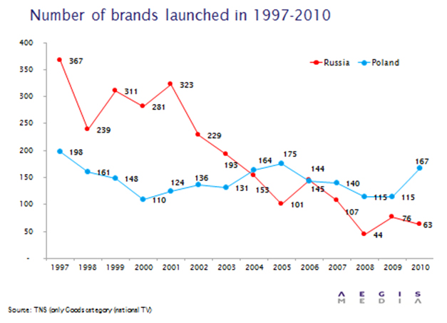 Отток капитала из страны убивает российские брендыAegis Media посчитали новые торговые марки на ТВ. Результат неутешителен – год от года их становится все меньшеAegis Media обнародовали итоги масштабного исследования, посвященного изучению появления новых брендов в эфире российских телеканалов. Выводы аналитиков неутешительны: за последнее десятилетие количество новых брендов неуклонно сокращается, что связывают, в первую очередь, с оттоком капитала из России. Исследователи задались целью определить количество новых марок, рекламируемых на национальном ТВ в течение года. Особое внимание уделялось классификации брендов на иностранные и отечественные. Анализируемый формат медиа размещения включал только национальные коммерческие блоки без спонсорской рекламы. Период исследования довольно длительный, с 1997 по 2010 гг. Объектом исследования являлись торговые марки, относящиеся к различным товарным категориям: автотранспорт, безалкогольные напитки и пиво, продукты питания, лекарства, товары для красоты и здоровья, бытовая техника, товары для детей, бытовая химия, товары для детей, одежда и обувь.