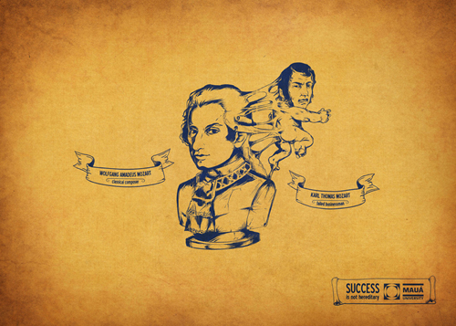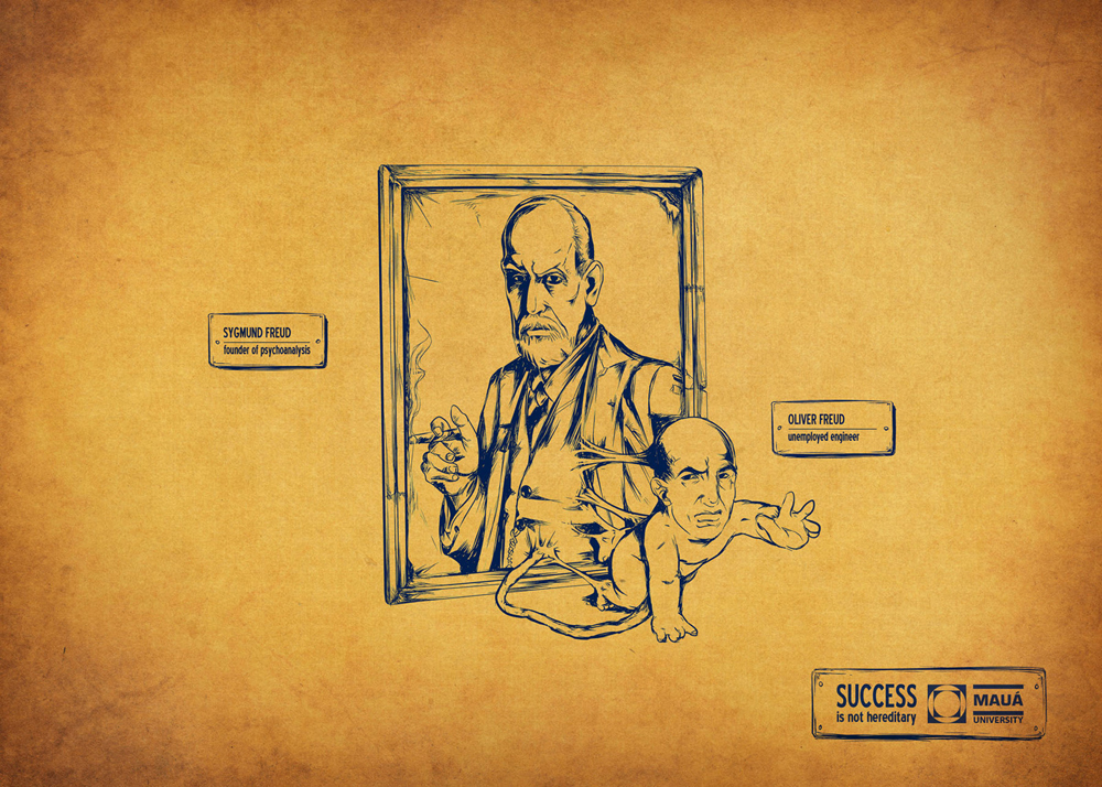 Родство с гением - не повод для успехаРекламная кампания бразильского Университета МауаАгентство Dim`Canzian`Facci из Сан-Паулу разработало сезонную рекламную кампанию для местного Университета Мауа. Поскольку в скором времени начнутся вступительные испытания для абитуриентов, университет начал привлекать их внимание к своей образовательной программе. Реклама иллюстрирует тезис о том, что если у кого-то был гениальный предок, много добившийся в жизни, то это вовсе не означает, что и его потомки смогут повторить это без каких-либо усилий. В качестве примера креаторы изобразили потомков Зигмунда Фрейда и Моцарта, которых вполне можно назвать неудачниками. Так университет намекает на необходимость хорошего образования, которое поможет достичь в жизни многого. Состав творческой группы |