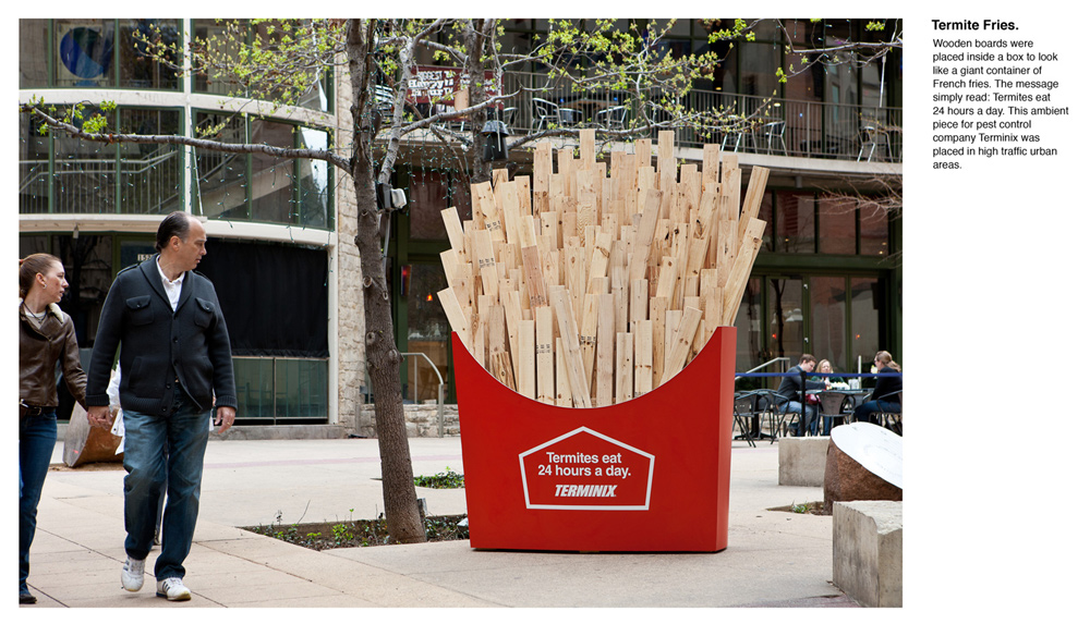 Terminix прировняли доски к картошке-фриУличная реклама средства от термитов заставляет задуматься о безопасности своего домаАгентство Publicis Dallas из США разработало прекрасную и наглядную рекламу для средства против термитов Terminix. Креаторы установили на улицах Далласа конструкции, которые выглядят как порции картошки-фри из «Макдоналдса», но вместо картофеля в них находятся свежие доски. Надпись на конструкции напоминает всем владельцам деревянных домов, что термиты едят 24 часа в сутки. Рекламный посыл – понятнее некуда – если люди не хотят подать свой дом паразитам как лакомство, то стоит воспользоваться Terminix.