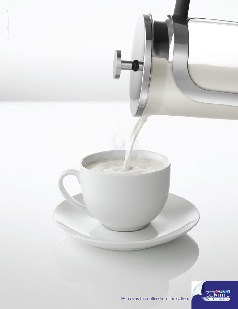 Crest 3D любой напиток превратят в молокоРеклама отбеливающих полосок для зубовАмериканское Publicis Dallas разработало рекламную кампанию для бренда отбеливающих полосок Crest 3D. Рекламисты изобразили различные «красящие» напитки и пищу, которые как по волшебству стали белыми. Так реклама подчеркивает отбеливающий эффект Crest 3D, которому по плечу даже кофе или красное вино. В слогане креаторы также подчеркнули эффект отбеливающих полосок – в случае с кофе он звучит так: «Удаляет кофе из кофе».