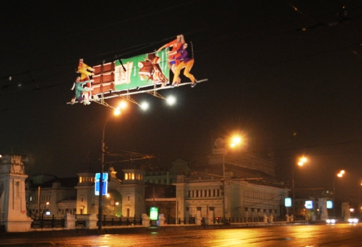 В новом размещении перетяжек для бренда Alpen Gold задействовано 25 носителей. Все они выполнены с использованием нестандартных элементов в виде большой шоколадки Alpen Gold длиной 5 метров. Шоколадку тянут в разные стороны 4 девушки, чтобы насладиться удивительным вкусом молочного шоколада с лесными орехами. Само полотно перетяжки, как носитель, отсутствует. Большая шоколадка состоит из трех сегментов, скрепленных воедино, и подсвечивается тремя внешними прожекторами. Кампания проходит по заказу агентства Starcom для KRAFT FOODS с 11 по 20 апреля.