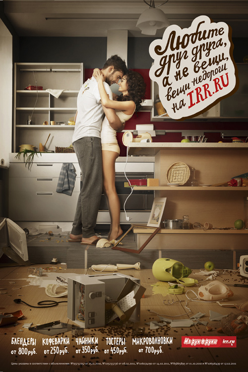 Instinct сделало серию принтов для сайта «Из рук в руки»«Пронто-Москва» освежило «Из рук в руки» при помощи «Инстинкта»РА Instinct разработало рекламную кампанию для сайта бесплатных объявлений «Из рук в руки». В ее основе лежит идея о том, что с порталом «Из рук в руки» вы можете больше не переживать из-за высокой стоимости вещей и сконцентрироваться на чем-то действительно важном и ценном. Ведь на irr.ru есть возможность найти товары б/у, договориться о цене и купить действительно дешево. Своей главной целевой аудиторией команда Instinct выбрала покупателей, предполагая, что продавцы также охотнее обратят внимание на сайт с широкой покупательской базой. «Данные принты были подготовлены для наружной рекламы, для троллейбусов, для транспортной и indoor рекламы. Все это отправлено в регионы, пока они будут размещаться там ,в каждом городе – свой план по размещению. На данный момент мы еще не решили, стоит ли нам размещать рекламу в Москве. Наша задача сейчас заключается в том, чтобы усилить наш региональный бизнес. Каждый город имеет свой локальный бюджет для проведения рекламной кампании, и решения относительно ее масштабов и сроков будут приниматься на местах. Instinct является давним партнером по созданию рекламы для нагего холдинга, мы сотрудничаем с этой компанией на протяжении многих лет, они сделали нам рекламу «Житзнь в объявлениях», с которой мы взяли третье место на «Бренде года», они делали нам рекламу для job.ru в прошлом году («Нужные люди в нужном месте») – и мы получили хороший резонанс, поэтому пока мы не хотим менять партнера – он нас полностью устраивает.» - говорит директор по развитию продуктов «Пронто-Москва» Наталья Супрунюк «Наш бренд – «Из рук в руки» – широко известен, - добавляетя Супрунюк, - и интернет-сайт irr.ru – один из самых посещаемых в категории бесплатных объявлений. Сейчас нам хочется освежить бренд и акцентировать внимание пользователей на нескольких рубриках категории «Товары и услуги”, таких как «Электроника», «Бытовая техника», «Мебель и интерьер», «Строительство» и др. «Основной территорией коммуникации стала выгодная покупка – одна из главных причин обращения к порталу бесплатных объявлений, – рассказывают о новой кампании директор по стратегическому планированию Сергей Владимиров и младший менеджер по стратегическому планированию Мария Макаренко. – Однако, говоря о рациональных преимуществах, мы хотели сделать коммуникацию более вовлекающей, менее циничной. Так родилась концепция «Цените людей, а не вещи».