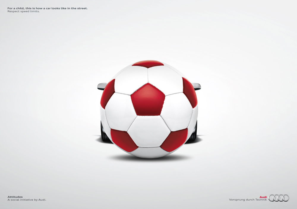 Для ребенка автомобиль - не больше воздушного шарикаКампания Audi, направленная на предотвращение ДТП с участием детейАвтопроизводитель Audi и агентство DDB Barcelona запустили социальную кампанию по предотвращению аварий с участием детей. Несколько принтов агентства показывают водителям, что дети без труда могут не заметить несущуюся на него машину, загородив ее воздушным шаром или мячом. Авторы кампании показывают автомобилистам мир глазами ребенка и просто призывают не превышать скорость. Состав творческой группы |