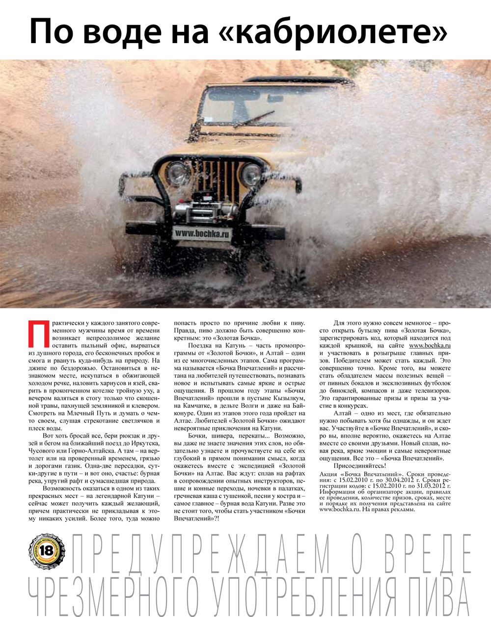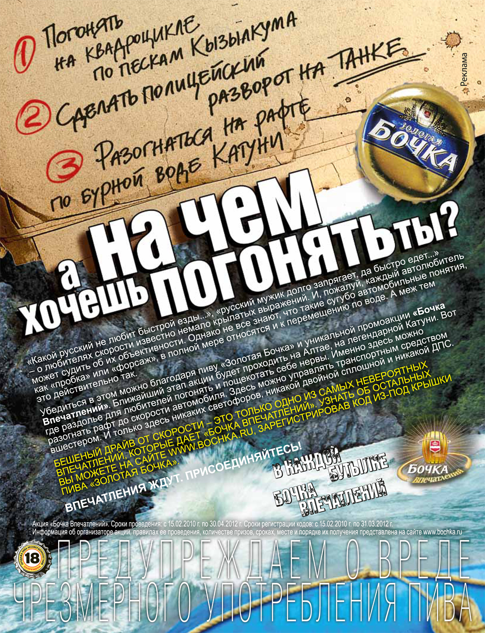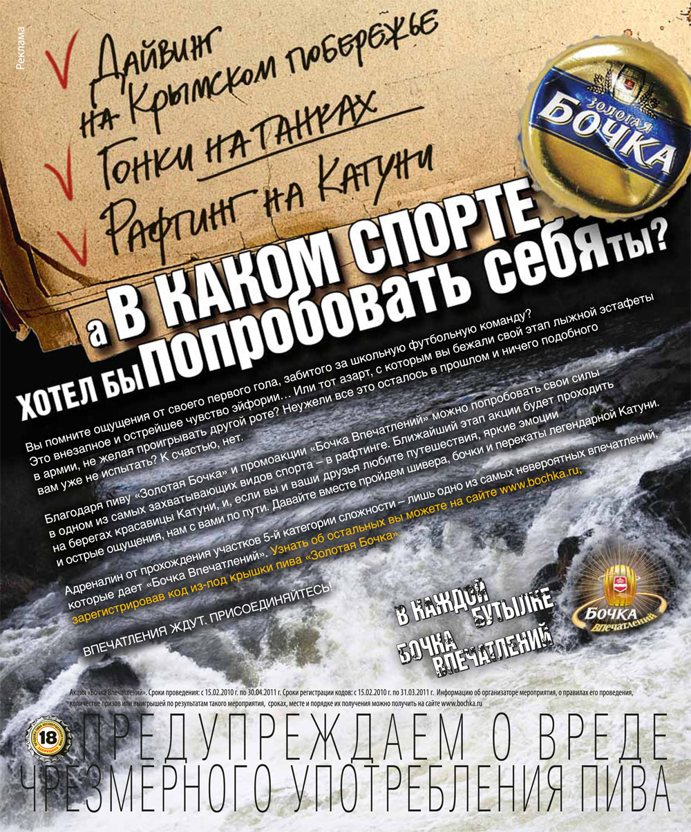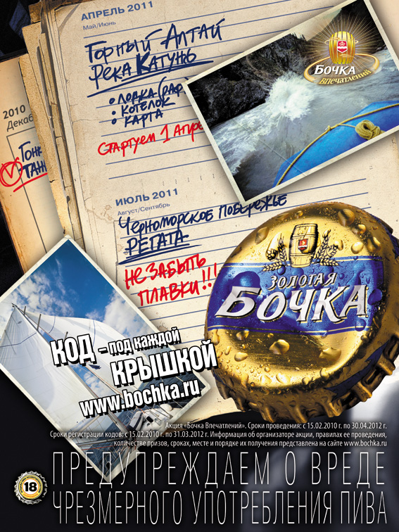 САБМиллер заказала новый сезон впечатлений для «Золотой бочки»JWT Russia продолжило рекламу впечатлений для "Золотой бочки"JWT Russia запустила в ротацию три новых ролика для пива "Золотая бочка". Концепция бренда не изменилась - ролики используются для того, чтобы рассказать потребителям "Золотой бочки" о возможности получить настоящие мужские впечатления. Также они рассказывают о возможности ввести коды с крышки пива на сайте www.bochka.ru, и получить в результате различные призы. При этом победители нынешнего сезона поедут сплавляться на рафтах на реку Катунь в Горном Алтае, примут участие в черноморской регате и в путешествии по Карелии. По нашим сведениям, нынешнюю рекламную концепцию "Золотая бочка" сохранит еще как минимум на протяжении года. Это не удивительно, ведь сайт "Золотой бочки" пользуется популярностью у потребителей - например, пост, в котором объявлено о розыгрыше на аукционе сплава по Катуни, собрал 638 комментариев. Коммуникация на сайте построена таким образом, чтобы давать пользователям надежду на получение ярких впечатлений. Отчеты тех, кто получал эти впечатления, можно посмотреть там же. "Программа изначально задумывалась как многолетняя. Первый год ее реализации показал ее успешность и, что самое главное, высокий потенциал. Так, на сегодня на нашем сайте количество уникальных зарегистрированных пользователей перевалило за сто тысяч и продолжает расти. Причем активность пользователей не снижается, а лояльность, как бренду "Золотая Бочка", так и самой программе впечатлений растет" - говорит менеджер по маркетингу САБМиллер РУС Алексей Вальский Помимо этого, JWT Russia выложило на сайте "Золотой Бочки" подробный фоторепортаж со съемок роликов (съемки взрыва и съемки в павильоне - хижина). Предыдущая реклама "Золотой бочки" была также сделана агентством JWT Russia. Креативная концепция была сделана таким образом, чтобы вовлечь потребителей бренда в коммуникацию на сайте. При этом победители аукционов, регулярно проводимых на сайте, прошли на джипах по Великому шелковому пути, путешествовали по Камчатке, поймали центнер рыбы на Волге и участвовали в гонке на танках.