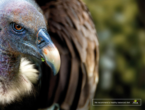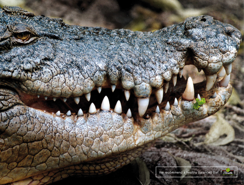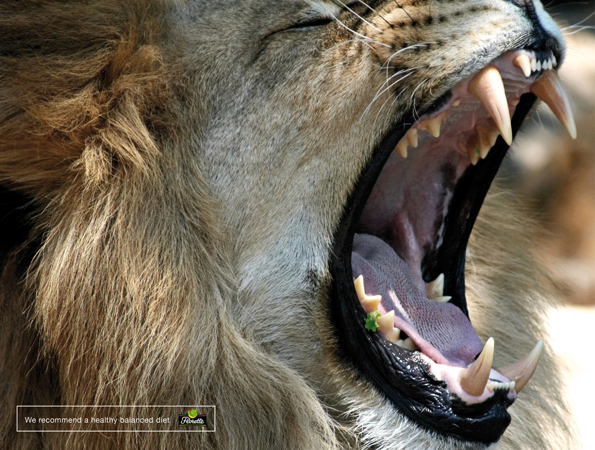 Свирепые хищники рекомендуют сбалансированную диетуРеклама главного европейского поставщика свежих овощей FloretteАгентство Bassat Ogilvy из Барселоны создало печатную рекламу для компании Florette,которая является крупнейшим поставщиком свежих овощей по всей Европе. Перед креаторами стояла задача подчеркнуть необходимость людей в сбалансированной диете, которая включала бы в себя не только мясо и быстрые углеводы, но и овощи. Для этого они изобразили достаточно свирепых хищников вроде льва и крокодила, между зубов которых застряли кусочки салата. Довод прост: если уж и лев готов добавить в рацион немного овощей, то и человеку стоит последовать его примеру.