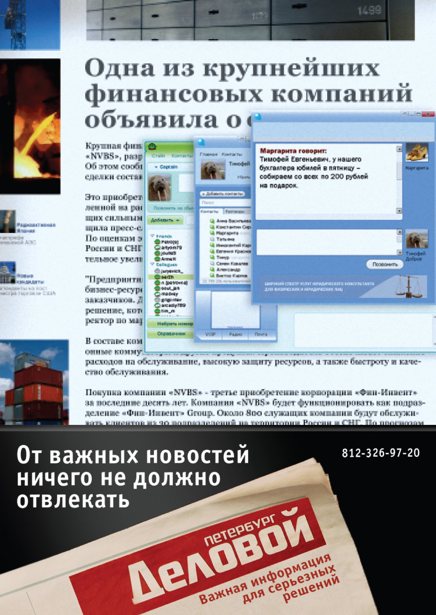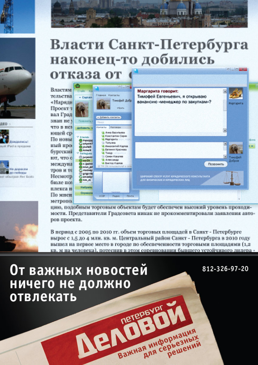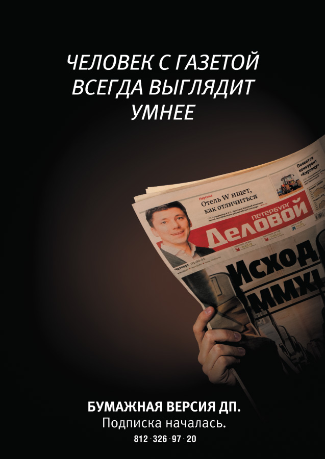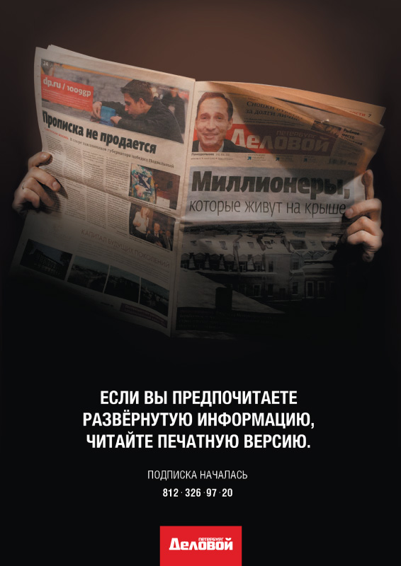 РА «НЕБО» подчеркнуло преимущество печатной прессы перед ИнтернетомГазета "Деловой Петербург" с помощью рекламной кампании старается поддержать интерес к бумажной периодикеГазета "Деловой Петербург" запустила кампанию по продвижению подписки на свою бумажную версию. Креатив для рекламной кампании "ДП" был разработан петербургским рекламным агентством "Небо". Деловой Петербург на данный момент - лидер рынка деловых изданий Петербурга с аудиторией печатной версии в 72 тысячи человек. Однако, важно отметить, что аудитория всех без исключения деловых изданий Петербурга сильно сократилась в период с 2008 по 2011 год. Это обусловлено как кризисом, так и сильной конкуренцией со стороны интернет-порталов. Этот тренд не уникален для России - в мире наблюдается та же тенденция уменьшения тиражей печатных изданий в пользу Интернет-газет. Издатель газеты "Деловой Петербург", компания "Бонниер Бизнес Пресс", поставила перед агентством задачу cоздать идеи для кампании, которая убедила бы петербургских руководителей не отказываться от подписки на "бумажную" версию Делового Петебурга. Кампания реализована в прессе и в виде direct-mail руководителям петербургских кампаний. Состав творческой группы