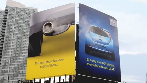С одной стороны двупланового билборда агентство разместило плакат с работающей выхлопной трубой и надпись: «Эта штука есть у более чем 1000 моделей на этом автошоу», с другой – изображение электрокара с надписью «Единственный на 100% электрический и безвыхлопной Nissan Leaf».