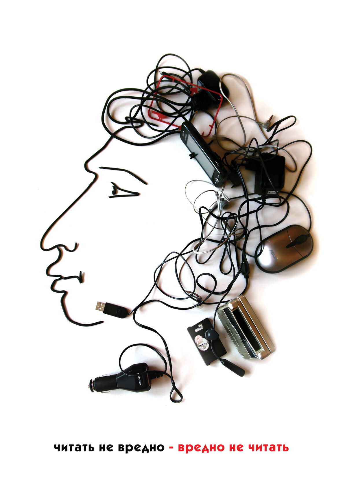 В пропагандирующем чтение конкурсе ЭКСМО победил цифровой ПушкинПевое место в конкурсе заняла работа дизайнера Марии КнязевойИздательство "Эксмо" провело конкурс плакатов, поропагандирующих чтение как процесс. Причиной послужило то, что, по данным издательство, чтением интерсуется на настоящий момент всего 23 процента россиян. "Лаконичный постиндустриальный портрет поэта, сложенный из проводов, зарядок, картриджей, мобильного телефона и другого электронного мусора - лишь часть большой серии "Классики", созданной Машей. Портреты Толстого из поп-корна и Гоголя из семечек, также выставленные на конкурс, получили максимальные оценки в он-лайн голосовании читателей на сайте ЭКСМО. Маяковский, Тургенев и Чехов пока еще не были показаны нигде. Ожидается, что серия целиком будет выставлена этим летом в Московском Музее Современного искусства (ММСИ) в рамках ежегодной выставки "Мастерская' 2011" - сообщает "Эксмо". |