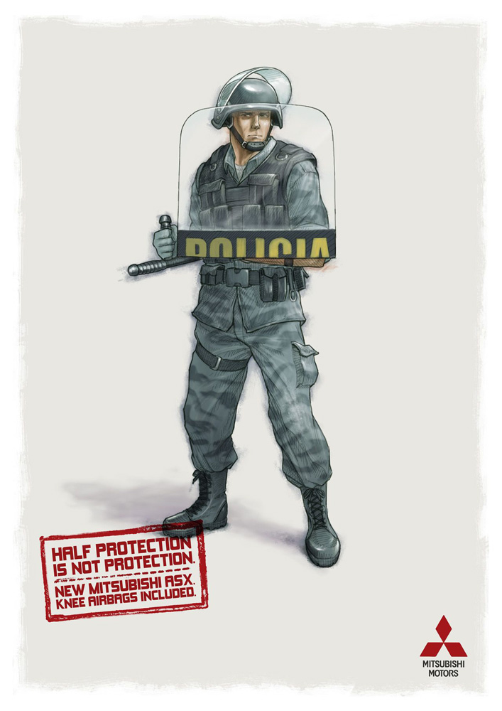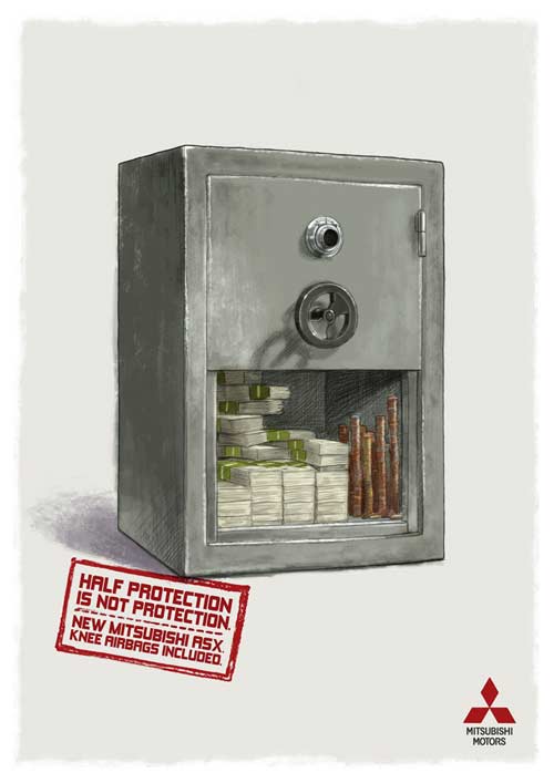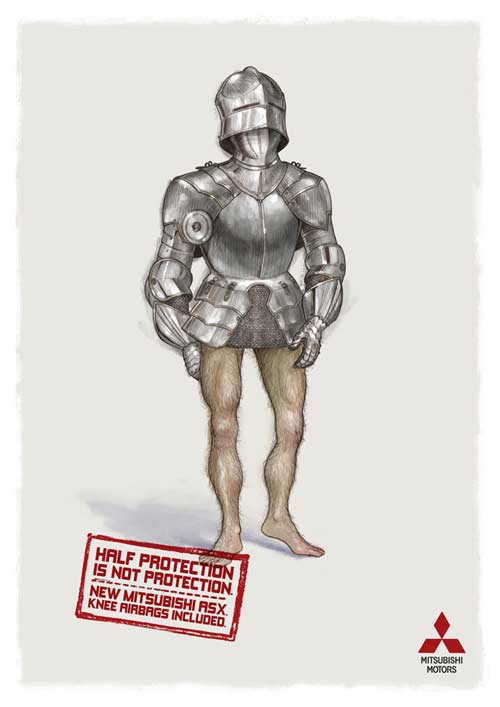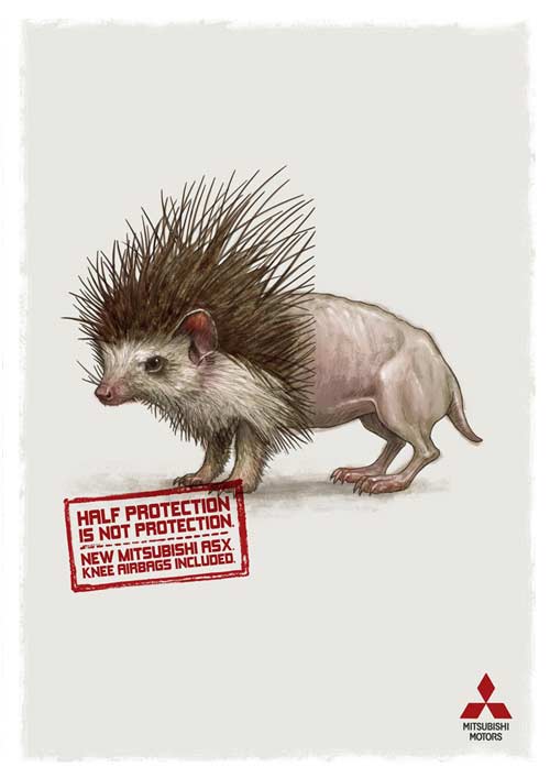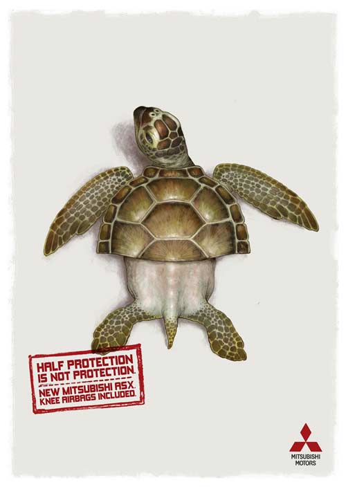Mitsubishi отрезало у черепахи пол панциряВ рекламе новой системы безопасности автомобилей Mitsubishi ASXАгентство Africa из Сан-Паулу создало интереснейшую рекламную кампанию нового Mitsubishi ASX. Этот новый кроссовер оснащен уникальной системой безопасности для водителя и пассажиров, которая включает в себя воздушные подушки в районе ног. Чтобы показать необходимость подобного решения, креаторы изобразили на принтах черепаху с половиной панциря, дикобраза с половиной иголок, рыцаря и полицейского, защищенных экипировкой только до пояса, а также сейф, с половинной дверцей. Идея более чем понятна и действительно заставляет задуматься об эффективности подушек безопасности автомобилей, которые оставляют нижнюю часть туловища незащищенной. Кампания проходит под слоганом "Половина защиты - это не защита". Состав творческой группы |