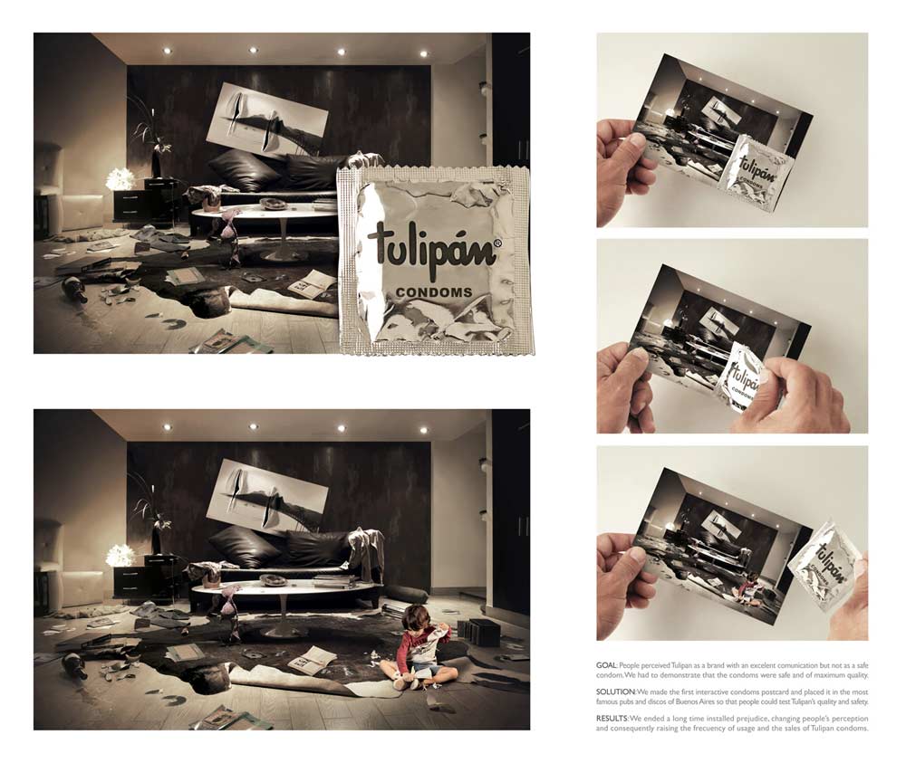 Tulipan продолжает сравнивать жизнь с детьми и безПродолжение сравнительной кампании презервативов TulipanSostav.ru уже писал о рекламной кампании презервативов Tulipan, в которой креаторы показали счастливые семейные пары без детей. Агентство Young & Rubicam из Буэнос-Айреса продолжает креатив в том же направлении. Новым витком кампании стали открытки с изображением жуткого бардака в комнате, на которую прикреплен презерватив. Суть рекламы заключается в том, что на первый взгляд, кажется, что разгром учинен во время бурного секса, но стоит отцепить презерватив с карточки, как в поле зрения попадает маленький ребенок и оказывается, что все это натворил он. Иными словами Tulipan словно бы предлагает выбрать, какой вариант бардака больше устроит семейные пары.
