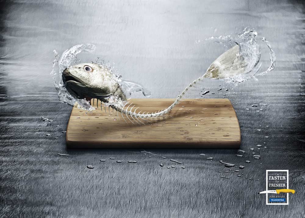 Как разделать рыбу, чтобы она осталась живаНереальная реклама ножей для рыбы TramontinaБразильское рекламное агентство DCS выпустило принт для компании Tramontina, выпускающую особые ножи специально для разделки рыбы. Реклама подчеркивает то, насколько они удобны для готовки и позволяют отделить мясо от костей за считанные минуты. Для большей наглядности рекламисты изобразили все еще живую рыбу, от которой в действительности остались только голова, хвост и костяк. Слоган кампании "Режьте быстрее, ешьте свежее". Состав творческой группы |