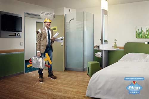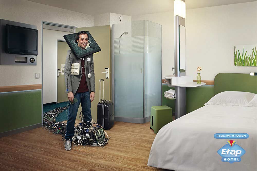 Etap Hotel - лучший момент самого плохого дняКампания европейской сети недорогих гостиницПарижское Young and Rubicam представило печатную кампанию для сети недорогих гостиниц Etap Hotel, располагающихся в разных городах Европы. Перед креаторами стояла задача показать эти отели как место, где всегда рады посетителям и люди сумеют найти понимание и отдых даже в самые тяжелые дни. Рекламисты проиллюстрировали это с помощью измученных работой людей, которые, судя по их виду, прошли как минимум через огонь, воду и медные трубы, но все равно на их лицах появляется блаженная улыбка стоит им только войти в свой номер в Etap Hotel. Слоган кампании "Лучшая часть вашего дня".