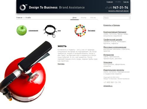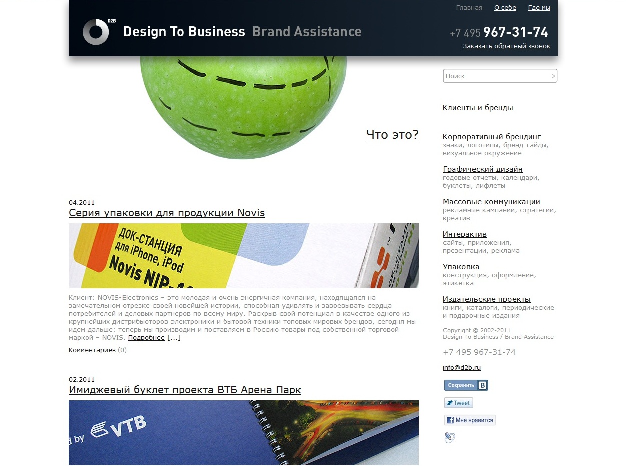 Новый фирменный стиль D2BСтудия Design To Business объявила о завершении процесса собственного визуального рестайлинга"Мы стали современнее, быстрее и легче: посвежевший знак и логотип отражают наше стремление придать творческому процессу харизматичности и новизны, а принципиально новая подача материала на сайте поможет потенциальному клиенту скорее обнаружить сходство характеров и подходов к дизайну и бизнесу", - утверждают в компании.