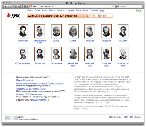 Студия Лебедева подрисовала усы единому госэкзаменуСервис "Яндекс ЕГЭ" получил новый дизайнСтудия Артемия Лебедева сделала дизайн для сервиса Яндекс - Егэ ege.yandex.ru Этот сервис позволяет любому желающему попробовать порешать задачи, похожие на те, что будут на настоящем экзамене. "По ним можно понять, как выглядят реальные задания, но в точности таких же на настоящем экзамене вы не встретите" - говорится в описании сервиса. Состав творческой группы