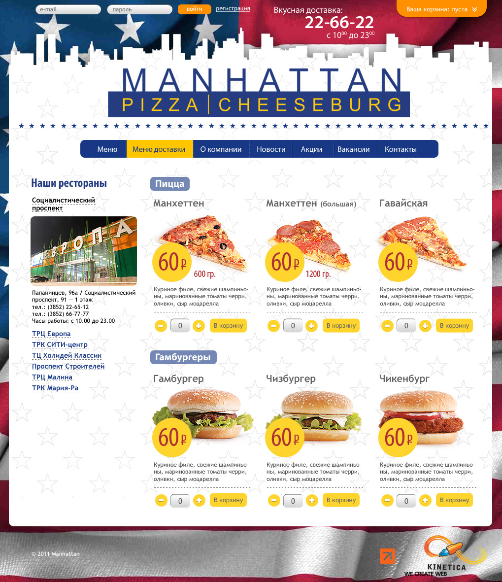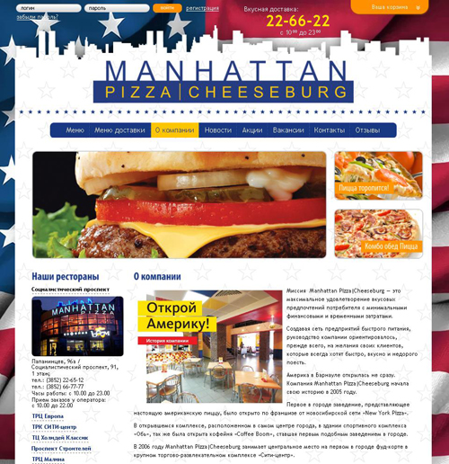 KINETICA представила корпоративный сайт и онлайн-службы доставки сети ресторанов Manhattan Pizza|CheeseburgCеть предприятий быстрого питания Manhattan Pizza|Cheeseburg работает в Барнауле с 2005-го года. Manhattan Pizza сегодня - это 7 ресторанов и фуд-кортов, один из которых расположен в Горно-Алтайске. Служба доставки Manhattan Pizza уже запомнилась барнаульцам телефоном 22-66-22 и вкусной, а главное, объёмной и недорогой пиццой, теперь же разместить заказ стало ещё удобнее - это можно сделать на сайте www.manhattan-pizza.ru, разработанном в веб-студии "Кинетика". "Использование платформы UMI при создании сайта позволило нам сконцентрироваться на дизайне, а не программировании, ведь модуль "интернет-магазин" этой CMS содержит весь необходимый в данном случае функционал, - рассказал директор по развитию агентства KINETICA Алексей Самойлов, - Перед нами стояла задача создать не только онлайн-сервис заказа пиццы, но и корпоративный сайт одной из крупнейших на Алтае сетей фастфуда. Поэтому входная страница отдана под сочные продуктовые и акционные баннеры, а в разделе "Меню доставки" главный объект внимания - это пицца, гамбургеры, напитки, их описание и цены". |