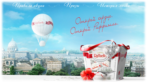 Raffaello позвало в Римские каникулыMojo сделало новый ролик для "Ферреро Руссия"Рекламное агентство Mojo разработало новый рекламный ролик бренда Raffaello. Тема воздушности и любви подчеркнута в нем при помощи воздушного шара, на котором улетают как герои ролика, так и сама конфета в десятисекундном промо-таге. Креативная концепция строится на утверждении, что "территория Раффаелло - это романтическая сказка, нежная и возвышенная. В сказках могут происходить чудеса: любовь обретает крылья, мечты сбываются и большое чувство, обретает идеальную и белоснежную форму, как Raffaello". При создании промо-ролика перед креативной командой ставились традиционные для такого рода роликов задачи: рассказать о механике акции - "открой и выиграй", продемонстрировать романтические призы в стиле Раффаелло, а также изящно оформленную промо-упаковку, сделав это в предельно лаконичной и сжатой форме 10 секундного тэга к основному ролику. Слоган "Открой свое сердце, открой Раффаэлло" призывает открыть упаковку и найти внутри один из гарантированных романтических подарков: изящные серебряные или золотые кулоны в форме сердца или сказочную поездку в вечный город любви Рим". Предыдущий ролик Рафаэлло был также сделан креативным бутиком Mojo. Тогда для рассказа о воздушности и любви Mojo использовало голубей.