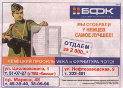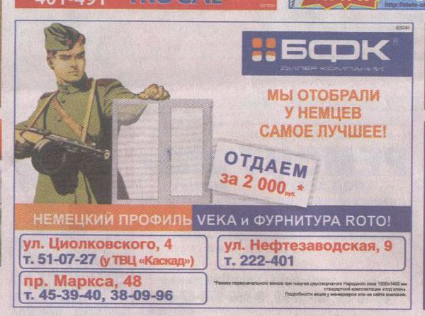 В управление Федеральной антимонопольной службы по Омской области поступили жалобы от ветеранов по поводу появившейся накануне Дня Победы в печатных СМИ рекламы пластиковых окон. В рекламе компании «БФК» был изображен солдат-победитель и содержался следующий текст: «Мы отобрали у немцев самое лучшее. Отдаем за 2000 рублей». Как сообщает пресс-служба УФАС, ветераны посчитали такую рекламу оскорблением. «Они-то точно знают, что Берлин брали не ради дешевых пластиковых окон», - говорят представители антимонопольного ведомства. УФАС напоминает, что согласно ч. 6 ст. 5 профильного федерального закона «в рекламе не допускается использование бранных слов, непристойных и оскорбительных образов, сравнений и выражений, в том числе в отношении пола, расы, национальности, профессии, социальной категории, возраста, языка человека и гражданина, официальных государственных символов (флагов, гербов, гимнов), религиозных символов, объектов культурного наследия (памятников истории и культуры) народов Российской Федерации, а также объектов культурного наследия, включенных в Список всемирного наследия». В связи с этим Омское управление антимонопольной службы решило провести опрос на своем сайте, чтобы выяснить, считают ли интернет-пользователи допустимым использование образа солдата-победителя в подобной рекламе. Опрос будет проводиться до 30 мая, по его результатам и будет приниматься решение по делу. |