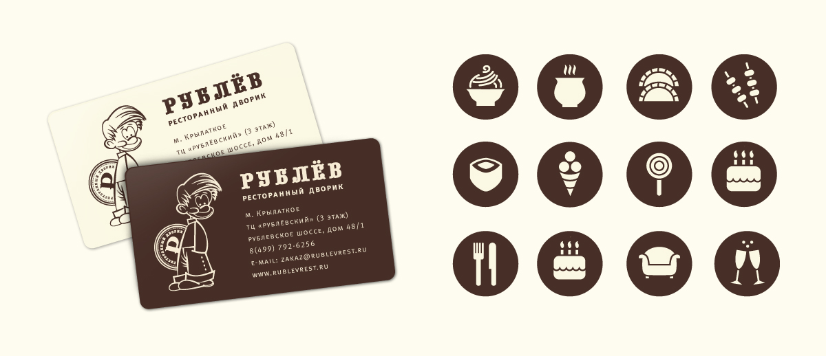 Фирменный стиль ресторана «Рублев. Ресторанный дворик» от дизайнеров LIN-ARTLIN-ART закончил работу над фирменным стилем ресторана "Рублев ресторанный дворик". Перед дизайнерами была поставлена задача создания нового графического образа ресторана. В процессе работы над логотипом возникла идея разработки фирменного персонажа. Так появился Рублев - вымышленный герой, послуживший основой для всей линейки фирменного стиля. Название "Рублев" обладает в сознании потребителя целым рядом устойчивых ассоциаций. Одна из них легла в основу придуманной нами программы лояльности, ориентированной на маленьких посетителей ресторана. Идея программы вкратце выглядит так: каждый заказ сопровождается выдачей вместе с чеком специального жетона-монеты "Рублев". "Монеты" можно накапливать и использовать в дальнейшем для покупки забавных сувениров и игрушек в специально оборудованном шоуруме. Для демонстрации всего комплекса возможностей ресторана был разработан специальный мини-сайт, для которого произведена фотосъемка интерьеров и блюд. Формирование цельного, комплексного графического образа - всегда интересная и увлекательная задача для дизайнеров.