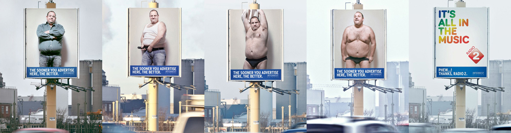 Оператор наружной рекламы угрожал стриптизомКреативная кампания для голландского оператора InterbestАгентство Y&R Not Just Film Amsterdam совместно с оператором наружной рекламы Interbest разработали креативную кампанию для привлечения рекламодателей. На одной из конструкций оператора агентство поместило изображение полного мужчины с подписью "Чем раньше вы будете рекламироваться здесь, тем лучше". На следующий день изображение изменилось - мужчина начал раздеваться и стало понятно, что реклама угрожает самым настоящим стриптизом этого толстяка, если никто не захочет разместиться на щите. Однако буквально в последний момент, когда герой кампании уже начинал стаскивать трусы, его изображение заменили рекламой радиостанции Radio2, которую опять же снабдили подписью: "Фух! Спасибо Radio2". Безусловно, проект не остался незамеченным, правда неясно действительно ли Radio2 стали новым клиентом оператора или они были лишь запасным вариантом, если никто так и не проявит активности, стремясь спасти людей о лицезрения тотального стриптиза. Состав творческой группы |