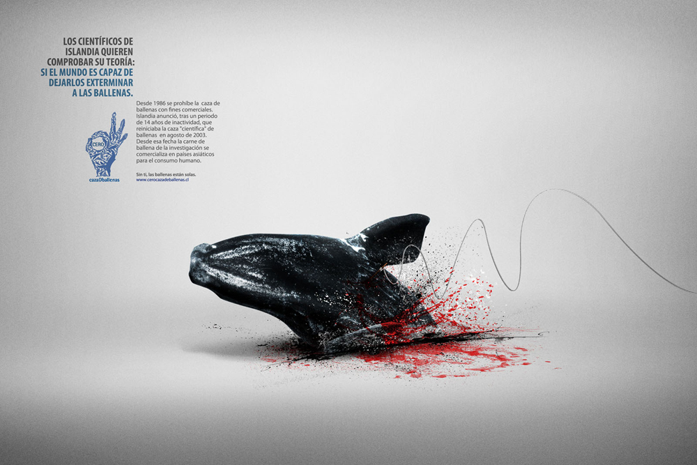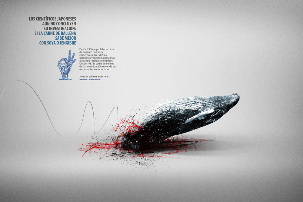 Организация Cero Caza De Ballenas против исландских и японских ученыхКампания против охоты на китов, прикрываемой наукойЧилийское агентство Los Quiltros выпустило несколько принтов для природоохранной организации Cero Caza De Ballenas, основная деятельность которой направлена на защиту китов. Кампания призывает выступить против коммерческого убийства китов, которое прикрывают научной деятельностью. Реклама сообщает, что, несмотря на то, что с 1986 коммерческий отлов китов находится под запретом, в Японии охота возобновлена с 1987 года, а в Исландии - с 2003. Возобновление отлова китов объясняется научной необходимостью, однако мясо убитых животных, почему-то оказывается на азиатских рынках. Состав творческой группы |