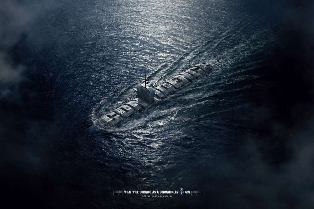 Подводная лодка как воплощение надежностиРеклама австралийских Королевских сил ВМФМельбурнское GPY&R и австралийский военно-морской флот выпустили кампанию, косвенно призывающую поступить на службу на подводные лодки. В рекламе отсутствуют бравурные призывы или давление на патриотизм, который зачастую присутствует в рекрутинговой рекламе. Вместо этого принты сдержанно рассказывают о том, что подводные лодки - это воплощение смелости и надежности, как и служащие на них люди. Состав творческой группы |