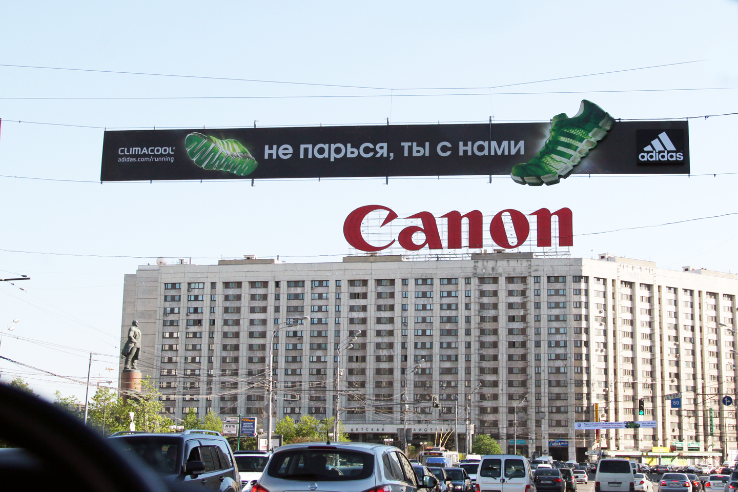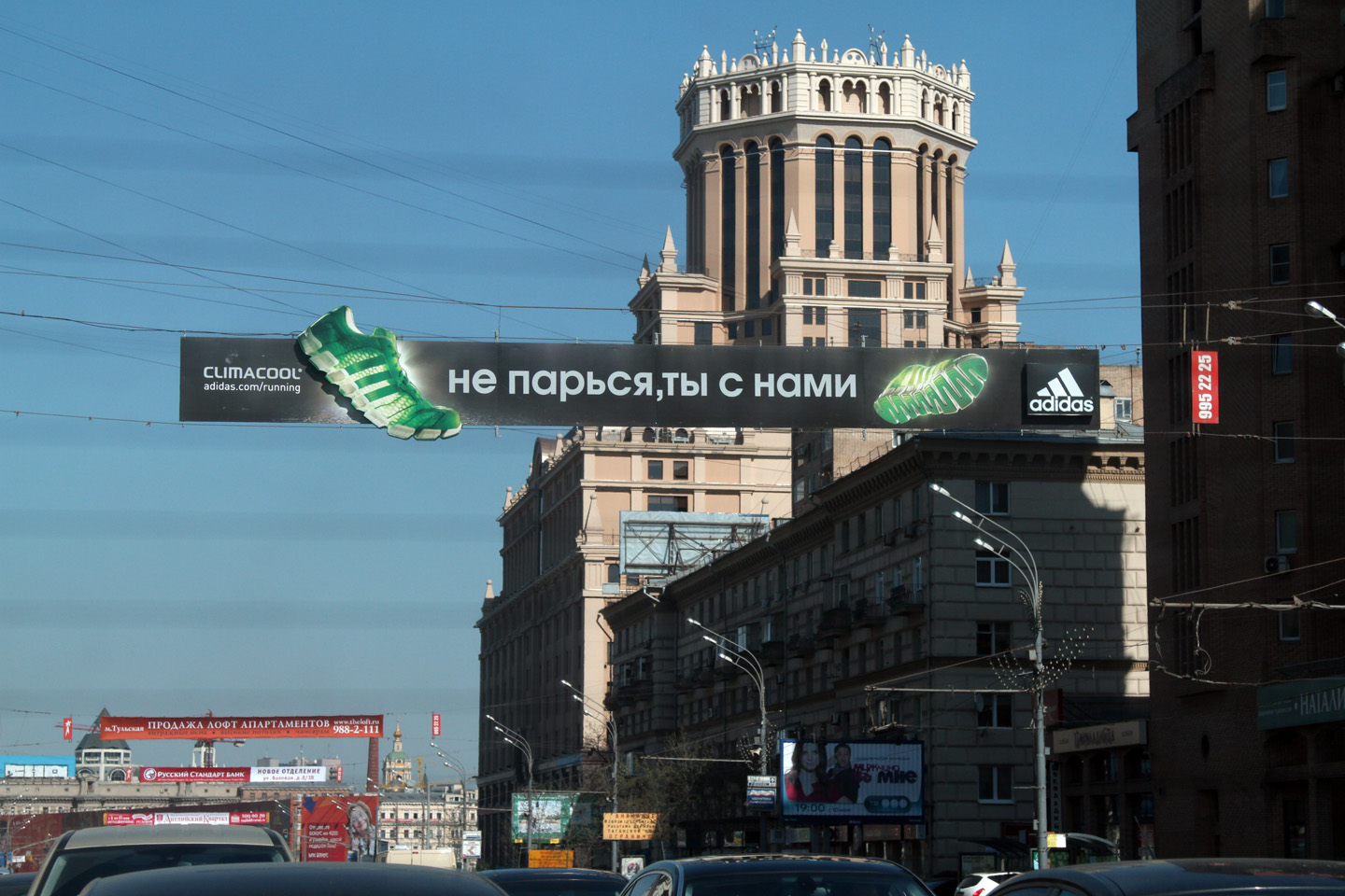Clima Cool Ride на световых перетяжкахadidas при поддержке медийного агентства Carat провёл мультимедийную рекламную кампанию, приуроченную к лончу кроссовок CC RideClima Cool Ride - профессиональные кроссовки, предназначенные специально для бега. Технология ClimaCool постоянно работает над выведением тепла и влаги, обеспечивая абсолютную воздухопроницаемость беговых кроссовок. Она помогает устранить главные источники дискомфорта за счет снижения уровня влажности и температуры. Модель CC Ride можно увидеть в ролике adidas "все с нами" с участием Лионеля Месси, Кэти Перри и других мировых звезд спорта и шоу-бизнеса. 15-секундный ролик Clima Cool Ride "беги с нами" с участием Дэвида Бекхэма появился на российских каналах 4-го апреля. Кампания в поддержку Clima Cool Ride также стартовала в Интернете - на Mail.ru и крупных спортивных онлайн-ресурсах и в наружной рекламе. Также в Санкт-Петербурге, Новосибирске и Екатеринбурге по заказу агентства Carat были брендированы троллейбусы. Каждая из световых перетяжек была выполнена из пластика, логотип и кроссовок выступали в виде экстендеров, изнутри подсвеченных статичной подсветкой. Слоган и слова "climacool" были сделаны из светоотражающей пленки, переливающейся на свету и бликующей в темноте. Разработка креатива и outdoor-консалтинг - Master Ad, Magic Touch (департамент нестандартных разработок Master Ad, российского представительства сети Posterscope). Оператором размещения на перетяжках является Московская Городская Реклама.