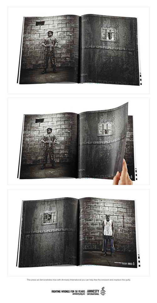 Amnesty International запирает в тюрьмы виновныхПечатная кампания известной правозащитной организацииОклендское Colenso BBDO и Amnesty International выпустили новую печатную кампанию, которая должна продемонстрировать, как сотрудничество с этой организацией может помочь освободить невиновных и отправить за решетку тех, кто этого действительно заслуживает. Реклама представляет собой 4 журнальные страницы, на двух из которых изображены заключенный и тюремщик, а еще две изображают дверь камеры с зарешеченным оконцем. Оконце сделано настоящим, так что в зависимости от того, как перевернуть страницу, в тюрьме оказывается или арестант, или его надзиратель. Состав творческой группы |