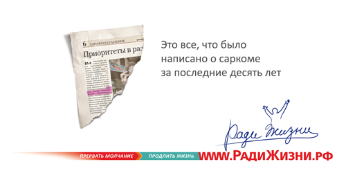 GN Interpartners сразилось рекламой с саркомойПредставьте, что вы живете-живете, и вдруг вам ставят диагноз "саркома". Редкий диагноз "саркома" - звучит как приговор, - рассказывают авторы. - Деньги на лечение выделяются по минимуму - диагноз замалчивается. Оправдываются тем, что нет эффективных средств лечения. А между тем, разработаны эффективные средства, которые мало кто закупает, и этим обрекает молодых и здоровых людей на смерть. Из-за незнания. Из-за молчания. Проект "Ради жизни" - это социальная активация для тех, кто не знает ничего про саркому, и узнав благодаря инициативе "радижизни.рф", может отдать свой голос и поделиться этим с друзьями в социальных сетях. Авторы предложили решение - от архитектуры и названия проекта до создания сайта и рекламы. Инициаторы проекта - Автономная Некоммерческая Организация - Восточно-Европейская Группа по Изучению Сарком и Межрегиональная общественная организация "Содействие больным саркомой". Это поможет собрать тысячи голосов, требующих современного лечения саркомы. Кампания, в которой наружная реклама и интернет-баннеры ведут на сайт www.радижизни.рф, стартовала 1 июня. Состав творческой группы