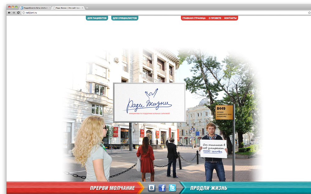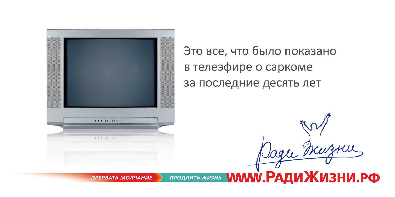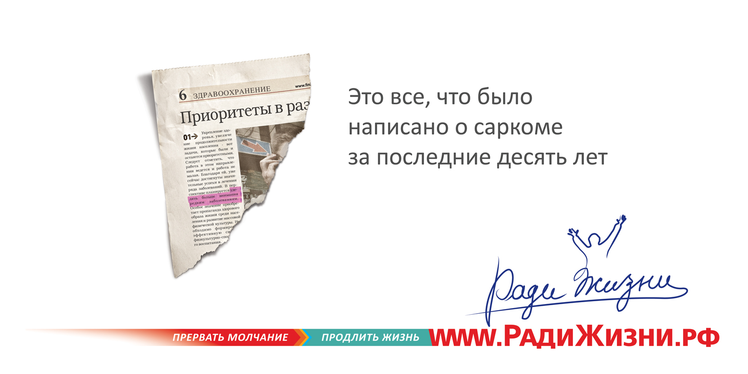 GN Interpartners сразилось рекламой с саркомойПредставьте, что вы живете-живете, и вдруг вам ставят диагноз "саркома". Редкий диагноз "саркома" - звучит как приговор, - рассказывают авторы. - Деньги на лечение выделяются по минимуму - диагноз замалчивается. Оправдываются тем, что нет эффективных средств лечения. А между тем, разработаны эффективные средства, которые мало кто закупает, и этим обрекает молодых и здоровых людей на смерть. Из-за незнания. Из-за молчания. Проект "Ради жизни" - это социальная активация для тех, кто не знает ничего про саркому, и узнав благодаря инициативе "радижизни.рф", может отдать свой голос и поделиться этим с друзьями в социальных сетях. Авторы предложили решение - от архитектуры и названия проекта до создания сайта и рекламы. Инициаторы проекта - Автономная Некоммерческая Организация - Восточно-Европейская Группа по Изучению Сарком и Межрегиональная общественная организация "Содействие больным саркомой". Это поможет собрать тысячи голосов, требующих современного лечения саркомы. Кампания, в которой наружная реклама и интернет-баннеры ведут на сайт www.радижизни.рф, стартовала 1 июня. Состав творческой группы