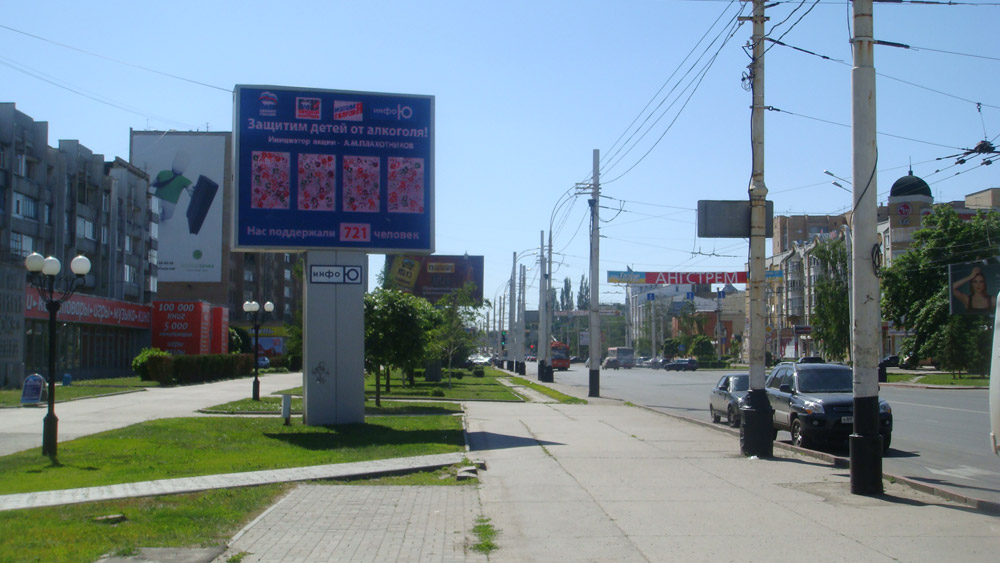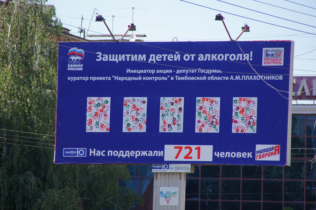 721 тамбовчанин поставил отпечаток ладони под призывом «Защитим детей от алкоголя!»1 июня на территории г. Тамбова проходила акция "Защитим детей от алкоголя", проводимая по инициативе депутата Государственной Думы, куратора федерального партийного проекта "Народный контроль" в Тамбовской области А. М. Плахотникова. Являясь главным информационным партнером акции, компания "Инфо-Ю", ведущий оператор наружной рекламы в Тамбове области, разместила на собственных конструкциях информационные материалы в поддержку акции "Защитим детей от алкоголя". Активисты проекта "Народный контроль" призывали тамбовчан выразить свое согласие с идеей оградить молодое поколение жителей региона от напитков, содержащих алкоголь. Взрослые и дети охотно оставляли "ладони" на специально подготовленных плакатах в знак солидарности с "Народным контролем". По итогам акции 721 человек поставил отпечаток ладони под призывом "Защитим детей от алкоголя!". Уже вечером 1 июня плакаты с отпечатанными ладонями были размещены в на биллбордах компании "Инфо-Ю", а на светодиодных экранах, расположенных в самом центре Тамбова, были запущены видеоролики с изображением "ладошек" и информацией о количестве поддержавших акцию участников. |