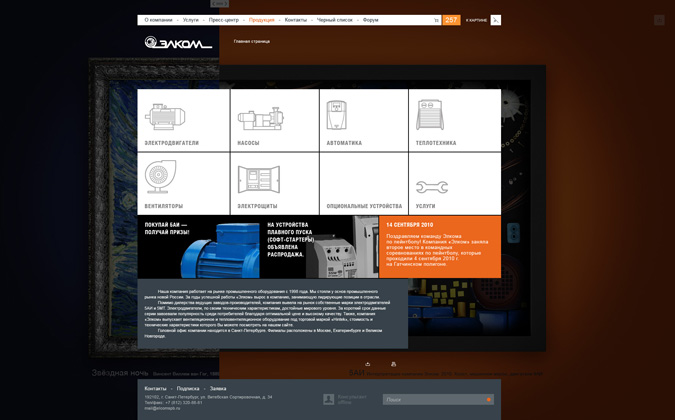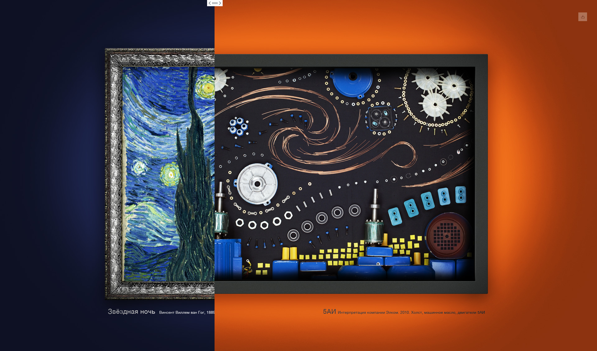В дизайн-студии Oblako для создания корпоративного сайта сделали копию известной картины Ван ГогаЗавершилась работа над сайтом для компании Элком - одного из крупнейших поставщиков электротехнической продукции в России. Необходимо было создать запоминающийся корпоративный сайт, удобный как для администраторов, так и для посетителей. После получения информации о целевой аудитории компании Элком мы организовали брейнсторм и сформировали несколько креативных концепций. Заказчик остановился на идее "двигатель, как предмет искусства". Мы настолько погрузились в мир виброизоляторов, роторов, дросселей и насосов, что на самом деле начали видеть в этих сложных конструкциях нечто непостижимо прекрасное. Воплощением креативной концепции стало создание репродукции известного произведения искусства, где в качестве художественного материала был использован двигатель 5АИ. Руководитель проекта Надежда Зубова лично разобрала его до мельчайших деталей, чем заслужила уважение мужской половины Oblako и представителей заказчика. После разборки мы получили набор многочисленных деталей, от крупных частей корпуса до мелких кусочков проволоки. Во время поиска подходящего творения нами было просмотрено множество картин, скульптур и инсталляций, но мы остановились на "Звёздной ночи" Ван Гога. Копирование полотна оказалось настолько увлекательным, что вопреки всем стандартам проектная команда расширилась практически до полного состава студии.