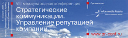 Компания infor-media Russia провела 8-ю Международную конференцию "Стратегические коммуникации. Управление репутацией компании". Мероприятие прошло при поддержке РАСО и IABC Russia 7-8 июня в Москве, в отеле "Swissotel Красные Холмы" и на теплоходе "Галина Уланова".