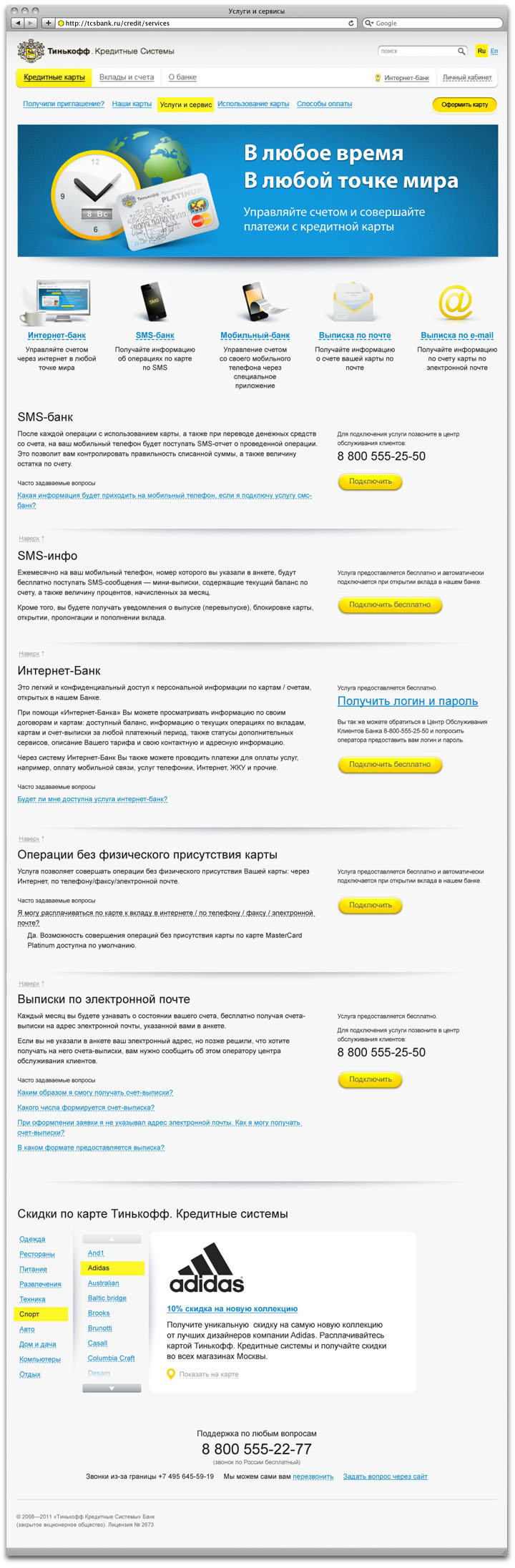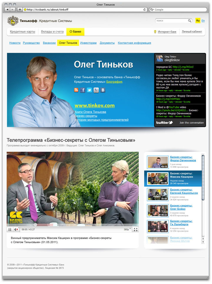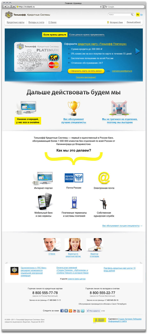 Студия Лебедева нарисовала сайт для банка «Тинькофф - кредитные системы»Тема Лебедев ответил Олегу ТиньковуСтудия Лебедева опубликовала шаблон нового сайта для банка «Тинькофф – кредитные системы". При этом Тема Лебедев рассказал у себя в блоге предысторию этой работы – по его словам, эти шаблоны были готовы еще в апреле, но заказчик – Олег Тиньков - решил сменить разработчика движка и пригласил некую голландскую компанию. По мнению Лебедева, именно эта голландская компания, а вовсе не студия Лебедева, виновата в срыве срока работ по сайту. Напомним, что месяц назад Олег Тиньков публично обвинял студию Лебедева в срыве сроков работ по сдаче новой версии сайта банка «Тинькофф - кредитные системы» и объявил о том, что ищет нового подрядчика. Тогда же Тиньков говорил о том, что готов продолжить сотрудничество со студией Лебедева "Почему же? Пока мы работаем, возможно и продолжим, если они сделают нас своим приоритетом", - заявял Тиньков Sostav.ru При этом в настоящий момент шаблоны, нарисованный студией Лебедева для банка "Тинькофф-кредитные системы", на самом сайте банка не используются. Представители банка комментировать ситуацию отказываются.