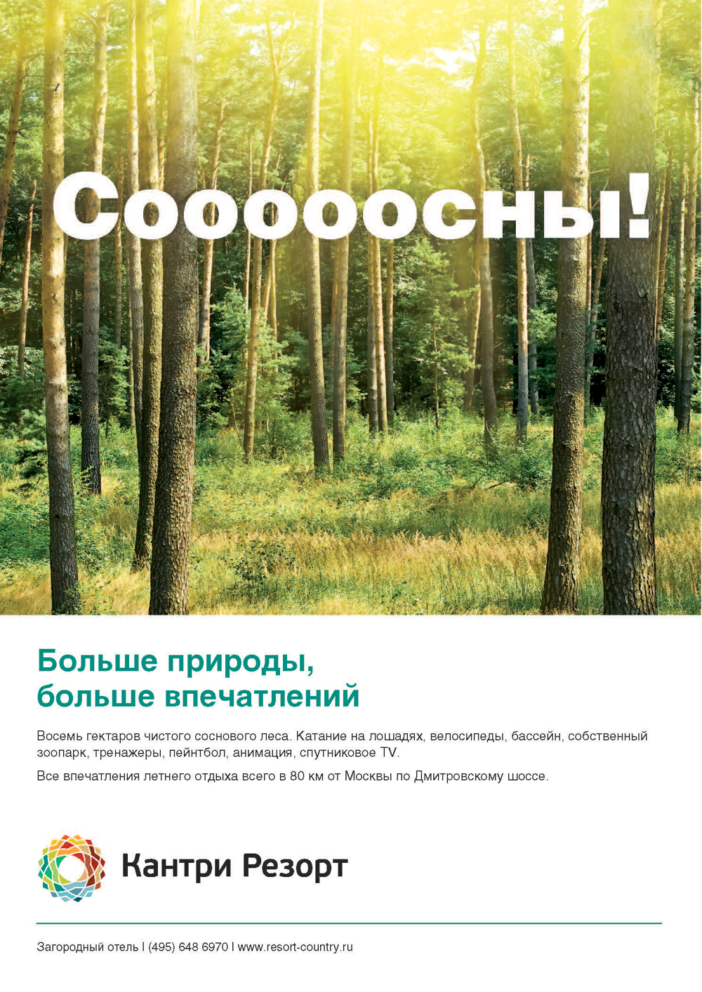 Сооооооосны, Мнооооооого. Крееееееатив от GreyВ начале мая в Москве стартовала рекламная кампания загородного отеля «Кантри Резорт», разработанная агентством Grey Moscow. Grey Moscow также разработало новый логотип отеля. «За основу логотипа мы взяли сосновую шишку, только с необычного ракурса, разные цвета соответствуют разным временам года, а оттенки - это то разнообразие впечатлений, которое вас ждет в этом необыкновенном по красоте месте», - говорит старший арт-директор Юра Пакуев. Это первая совместная работа команды агентства Grey Moscow и отеля «Кантри Резорт». Александр Ибрагимов, старший копирайтер Grey Moscow: «Мы рады, что благодаря нашей работе тысячи москвичей узнали о таком замечательном месте, как «Кантри Резорт», где они смогут насладиться прекрасным отдыхом и получить мнооооооооооого ярких впечатлений». Состав творческой группы Команда Country Resort: Команда Grey Moscow: