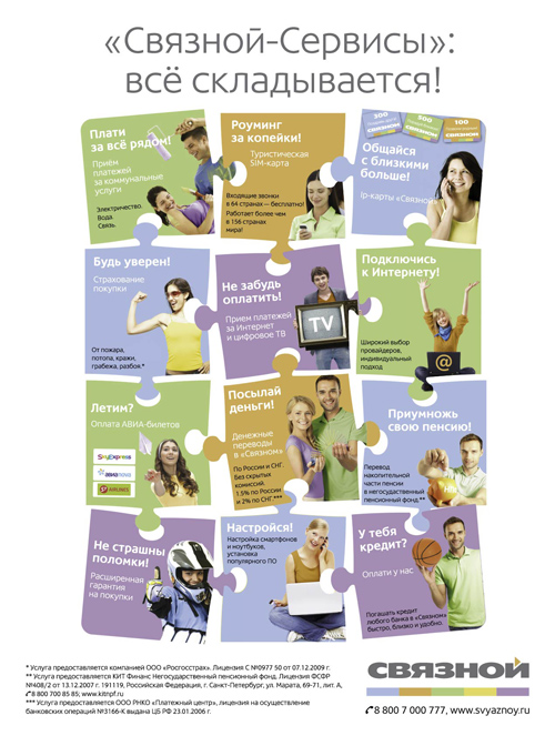 У «Авроры» всё складываетсяФотографии для новой кампании отснял Роман КадарияВ продолжение рекламной кампании, предложенной Креативным агентством "Аврора" в рамках тендера на создание ролика для группы компаний "Связной", весной 2011, была разработана серия макетов для размещения в метро. С помощью них продолжают продвигаться сервисы для покупателей, которые предлагает "Связной", так как дополнительные сервисы - одно из наиболее важных направлений работы компании. "Все складывается" - это главный слоган кампании, а также отражение функциональности сервиса: в нем собраны все постоянно необходимые потребителям службы. Теперь можно забыть о впустую потраченном времени. Все услуги собраны в одном месте. Легко, доступно и просто. В качестве фотографа "Аврора" пригласила на проект известного и очень талантливого Романа Кадария, который, несмотря на предпочтения работать с селебрити, с удовольствием принял участие в проекте. Состав творческой группы