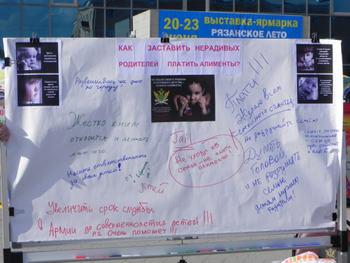 Рязанские судебные приставы провели акцию «Судебные приставы - детям»Социальная реклама службы судебных приставов напоминает акцию проекта "Все равно?!"Управление Федеральной службы судебных приставов по Рязанской области провело социальную акцию под названием «Судебные приставы – детям», сообщает новостной портал «Наша Рязань» Целью акции является привлечение внимания граждан к проблеме неуплаты алиментов и создание в обществе нетерпимого отношения к родителям, уклоняющимся от уплаты алиментных платежей. Около ста рязанцев, большинство из которых составила молодежь, изложили в письменной форме (на стенде с социальной рекламой по алиментам) свое мнение о мерах воздействия на родителей, не выплачивающих алименты своим детям. Жители города предложили отправить нерадивых родителей на принудительные работы, развесить их фото по городу, лишить родительских прав и свободы, а также пожелали всем любить своих детей и хранить семейные ценности. Следует отметить, что визуально механика акции очень напоминает акцию, проведенную Young&Rubicam и News Outdoor в рамках проекта «Все равно?!», в ходе которой на Тверском бульваре гражданам предлагалось написать на чистом листе, изображающем психику ребенка, абсолютно любую фразу.