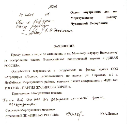 Главный редактор чувашской газеты назвал «Единую Россию» партией жуликов и воровМестное отделение «Единой России» немедленно пожаловалось на него в ОВДГлавный редактор и учредитель газеты «Взятка» Эдуард Мочалов сменил слоган на здании администрации агрофирмы «Лидер» в которой, по всей видимости, и издается эта газета. Раньше плакат просил помочь «Единую Россию» помочь в борьбе с коррупцией, сейчас он использует раскрученный Алексеем Навальным слоган «Единая Россия - партия жуликов и воров!». Газета «Взятка» издается в Чувашии, в моргаушском районе. По словам Мочалова, ему надоело, что «Единая Россия» не обращает внимания на публикации о фактах коррупции. «За все это время, когда на здании администрации агрофирмы «Лидер» висел плакат «Единая Россия» помогите в борьбе с коррупцией» ни местная власть, ни республиканская и даже федеральная власть не замечали публикации газеты «Взятка» по самым животрепещущим проблемам жителей Чувашии, граждан Российской Федерации. Хотя при цивилизованном обществе, действительной демократии, каждый такой факт коррупции, казнокрадства, ущемления прав и свобод граждан, о котором мы ведаем всему миру, должен стать объектом пристального внимания как законодательных, так и исполнительных органов власти», - рассказывает публикация в газете «Взятка». При этом смену лозунга в местном отделении «Единой России» заметили - секретарь моргаушского отделения «Единой России» Юрий Иванов написал адресованную в ОВД Моргаушского района Чувашской республики заявление, в котором он просит принять меры к Мочалову за оскорбление партии «Единая Россия». Иллюстрация с ресурса anticorruption.ucoz.com |