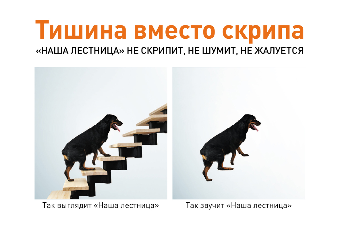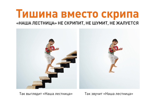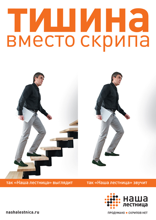 Агентство «Мастер Ум» выступило против скрипаКреативное агентство "МастерУм" ("Дэнекс") разработало рекламную кампанию для российского производителя модульных лестниц под маркой "Наша лестница". Задача, поставленная перед агентством - отвоевать долю рынка у производителей деревянных лестниц. Основной недостаток продукции конкурентов - это скрип, который проявляет себя через некоторое время после установки деревянной лестницы. Поэтому основной удар был нанесен именно в это их слабое место. Тишина вместо скрипа - основной лозунг новой рекламной кампании для марки "Наша лестница". Кампания проводится в Москве, Санкт-Петербурге, а также в местах продаж региональных дилеров заказчика. Состав творческой группы: