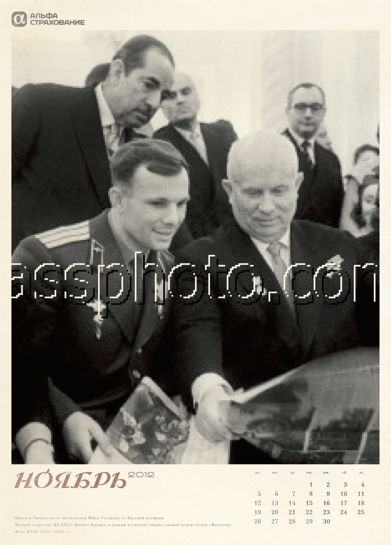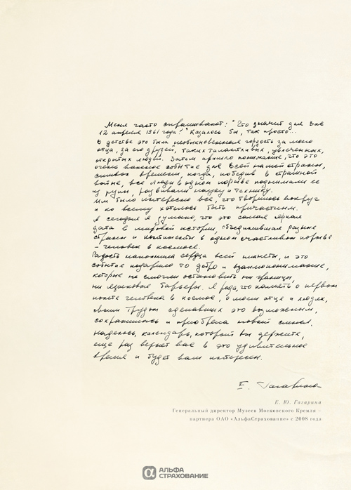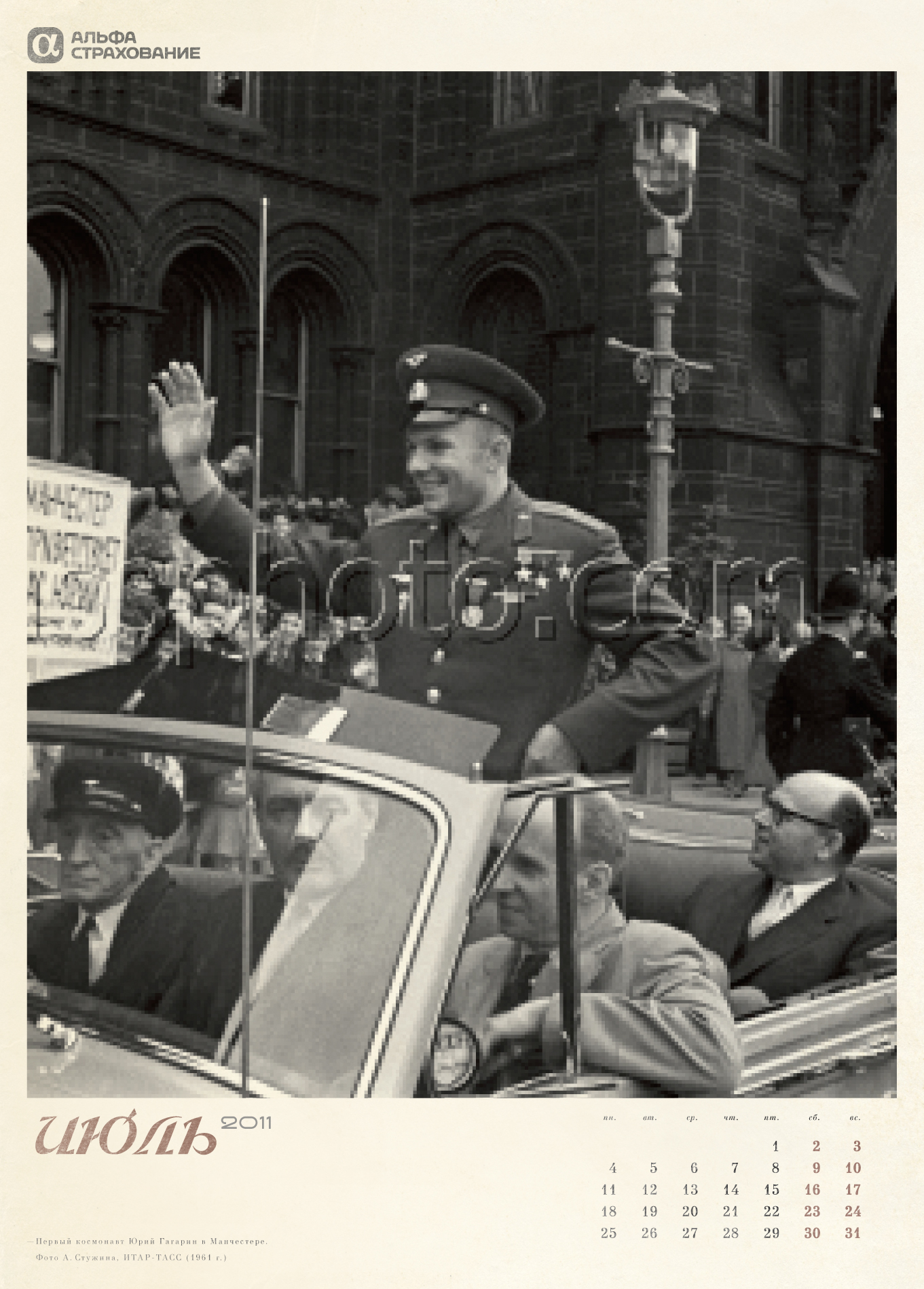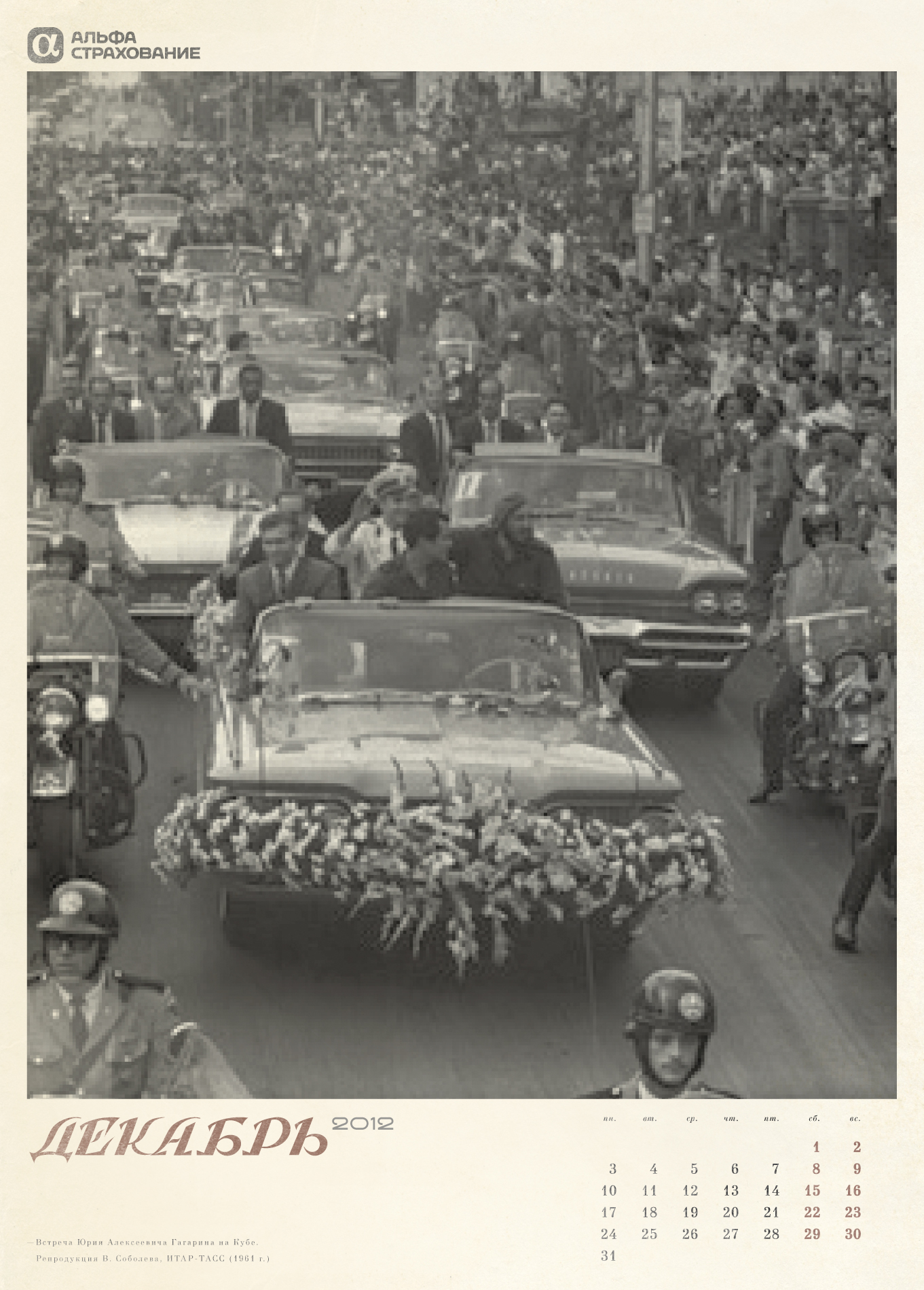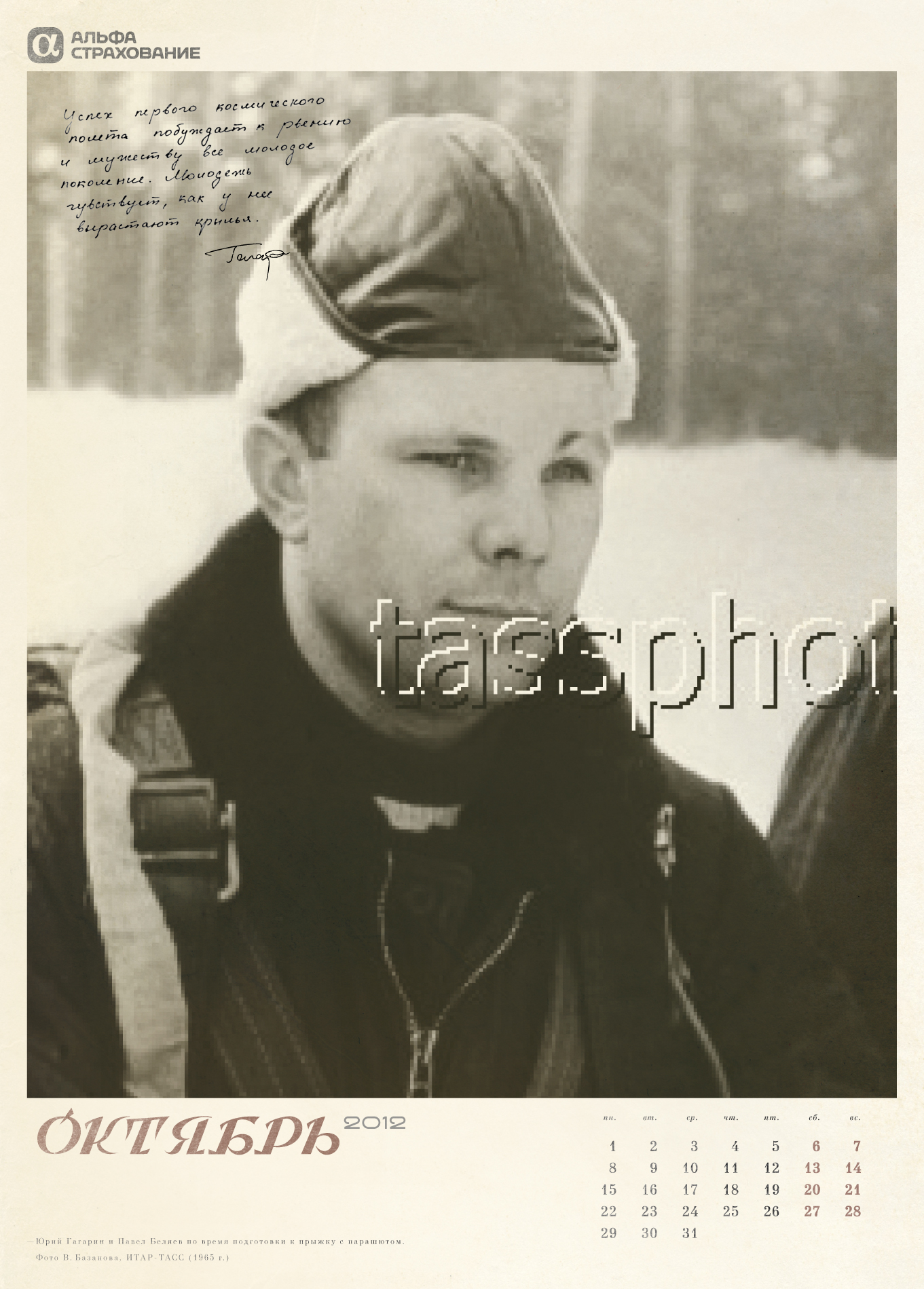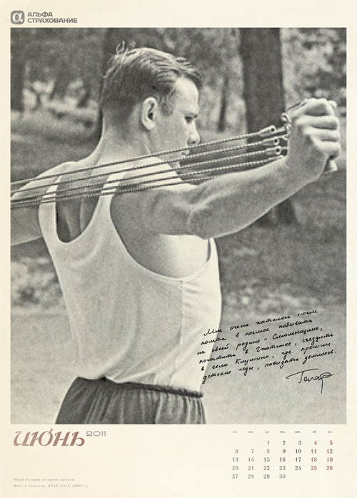 Юбилейный креатив от «АльфаСтрахование»Накануне 50-летнего юбилея первого полета человека в космос компания "АльфаСтрахование" выпустила памятный календарь, посвященный этому событию. Расширенный календарь охватывает период с апреля 2011 года по декабрь 2012 года. На 21 странице издания содержатся снимки первого космонавта в официальной обстановке, с друзьями, в кругу семьи. Все фотографии были взяты из архивов ИТАР-ТАСС, часть из них хорошо известна публике, часть демонстрируются реже, и в целом подборка создает всестороннее представление о духе эпохи начала освоения космоса. Вступительное слово к календарю написала дочь первого космонавта Елена Гагарина, для которой день 12 апреля 1961 года стал важным событием семейной истории. "Обратившись к Елене Юрьевне, мы надеялись на то, что она поделится своими личными воспоминаниями, личным восприятием этого дня, - отмечает Андрей Куча, Руководитель направления страхования культурных ценностей ОАО "АльфаСтрахование". - И мы благодарны ей за искренние и неформальные слова, которые она нашла для нашего издания". Календарь издан тиражом 730 экземпляров в настенном варианте и предназначен для подарков в качестве сувениров. Автор идеи: Студия "DEZA"