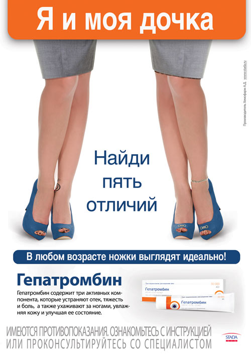 "Нам удалось создать макет, который вовлекает читателя в игру своим призывом: "Найди пять отличий между мной и моей мамой". Выискивая их, он проникается основным сообщением - с возрастом меняются предпочтения в одежде, аксессуарах, но естественная красота ножек сохраняется благодаря Гепатромбину", - говорит старший рекламный снайпер Роман Мамаев. Размещаться макет будет в печатных глянцевых изданиях и метро. Это уже не первый проект, выполненный Рекламными снайперами для компании STADA. В начале 2010 года агентство одержало победу и реализовывало креативное сопровождение препарата "СНУП" А в конце прошлого года был выигран тендер на разработку креативной концепции препарата "Алломедин".