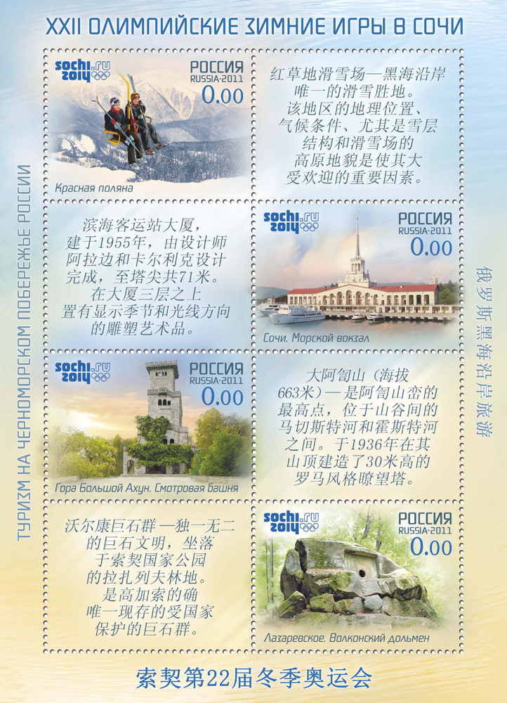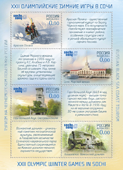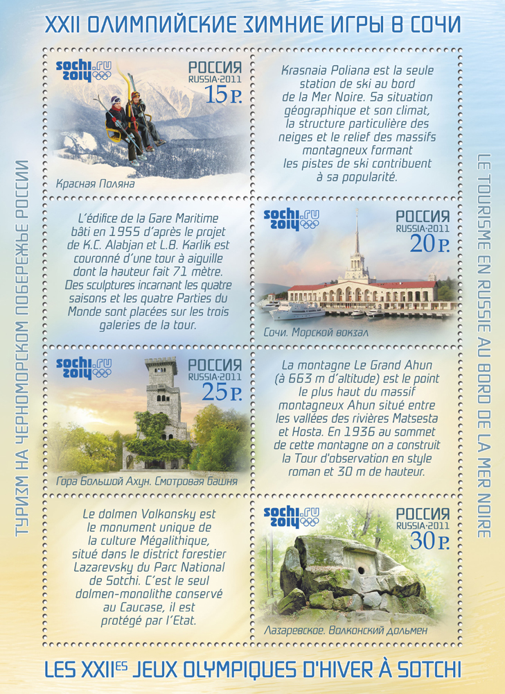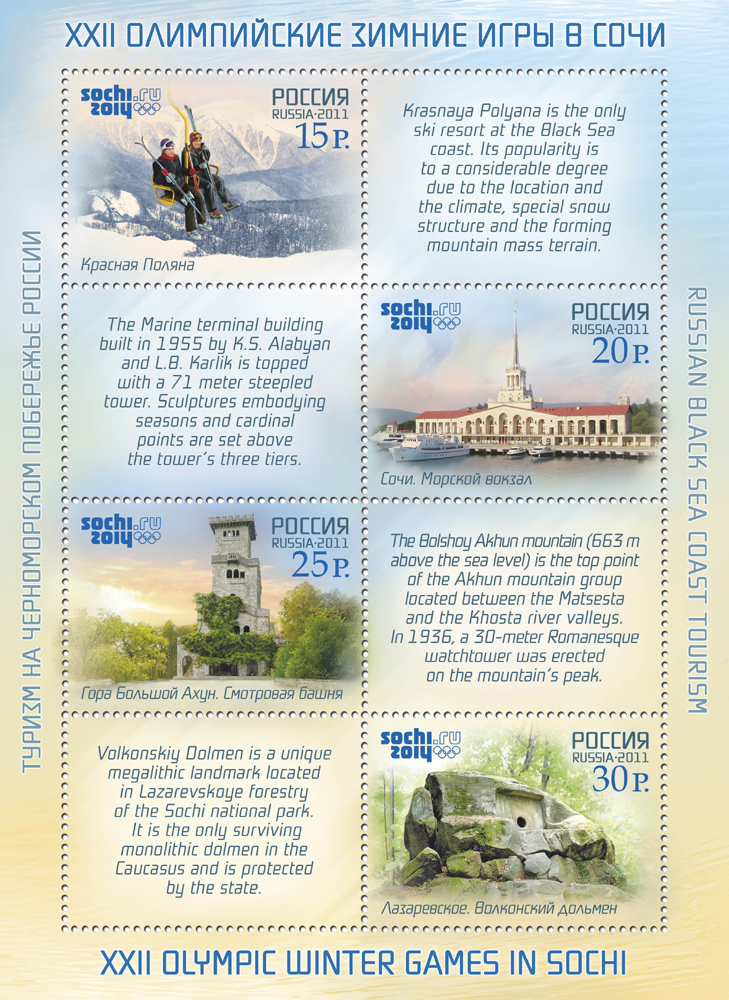 Первые четыре марки серии «XXII Олимпийские зимние игры в Сочи. Туризм на Черноморском побережье России» выйдут в обращение осенью 2011 года. Уникальность марок «Сочи 2014» заключается в том, что они станут самыми мультиязычными за всю историю олимпийского движения. Всего будет выпущено 6 вариантов листов, на каждом из которых информация на купонах и на полях листа будет дана на разных языках: русском, английском, французском, немецком, испанском и китайском.