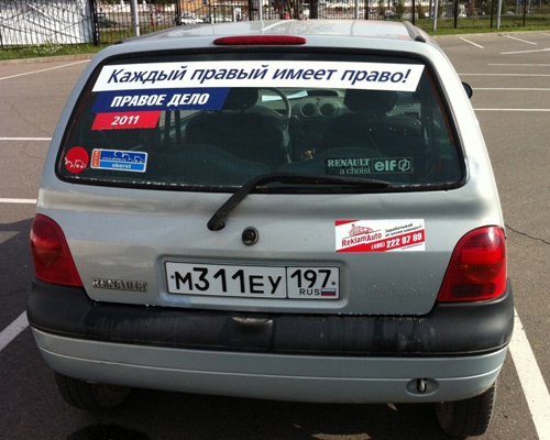 Михаил Прохоров стал первым политическим клиентом Reklam AutoРекламная кампания проходит под слоганом «Каждый правый имеет право!»Станислав Кауфман заключил первый контракт для размещения политической рекламы на автомобилях частных лиц, сообщает РБК-daily. Его клиентом оказался руководитель партии «Правое дело» Михаил Прохоров. Компания Reklam Auto, владельцем которой Кауфман стал в начале июня, занимается размещением рекламных сообщений на автомобилях частных лиц. Рекламная кампания «Правого дела» проходит под слоганом «Каждый правый имеет право!» Кауфман приобрел агентство Reklam Auto после того, как сам успешно воспользовался его услугами, проведя с его помощью рекламную кампанию принадлежащей компании «Винэксим» марки водки «Володя и медведи». На настоящий момент с агентством заключили договор на проведение рекламной кампании около трех тысяч автомобилей. На «Володе и медведях» автомобилисты зарабатывали от одной до девяти тысяч рублей в месяц. Фото с сайта rbcdaily.ru