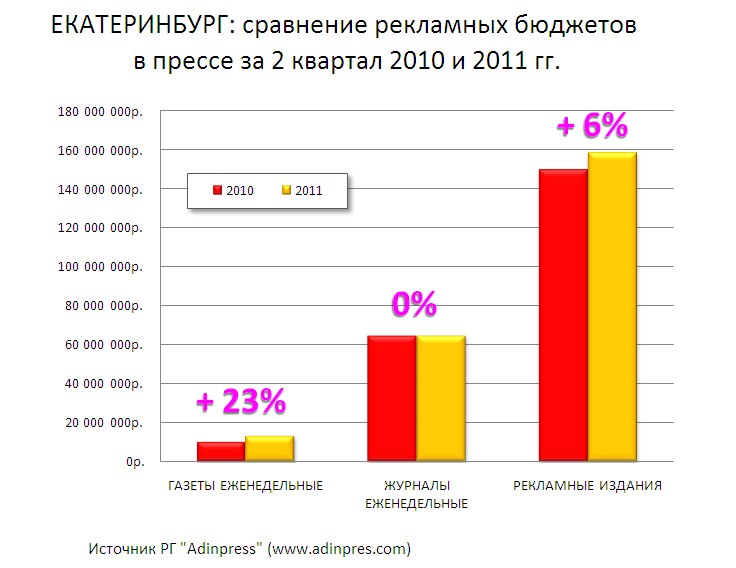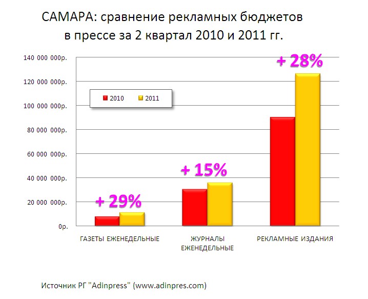 Реклама в региональной прессе прибавила 12%По данным мониторинга рекламы в прессе от рекламной группы Adinpress, объем местных рекламных бюджетов за второй квартал 2011 года, по сравнению с аналогичным периодом прошлого года, в Челябинске увеличился на 11%, в Екатеринбурге на 5%, а в Самаре на 20% Динамика показателей бюджетов, по сравнению с первым кварталом, увеличилась в два раза. Во втором квартале ситуация с распределением рекламных бюджетов практически не изменилась. По прежнему локомотивом роста являются издания строительной тематики. Также, почти везде, хорошо прибавляют еженедельные общественно-политические газеты. В сегменте бесплатных массовых рекламных газет ситуация в каждом городе своя: Так в Екатеринбурге у всех наблюдается падение, в Самаре у всех увеличение, а в Челябинске есть рекламные газеты с хорошим плюсом, но есть и те, кто в минусе. Похожая ситуация с телегидами. Хуже они себя чувствуют в Екатеринбурге, чуть лучше в Самаре и Челябинске. Что касается количества рекламы в упоминаемых городах, то, в среднем, этот показатель вырос на 10%. |