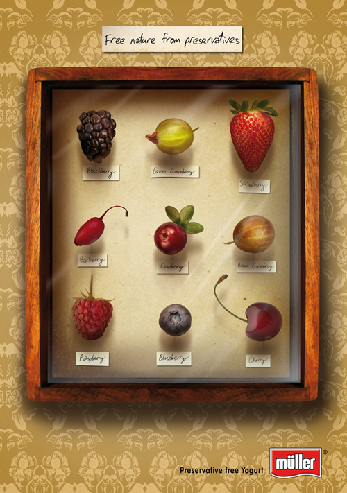 Muller призывает спасти натуральные продукты от консервантовОб этом свидетельствует новый принт, рекламирующий йогурты компанииИзраильское агентство Yehoshua TBWA при создании рекламы решило обойтись без изображения продукта, разместив на принте приколотые к дощечке ягоды (так обычно выглядят коллекции редких насекомых) и надпись: «Освободите природу от консервантов». Идея создателей принта заключалась в том, что современные производители все меньше используют натуральные продукты и все больше консерванты, в отличие от Muller, конечно. В Израиле, где йогурты пользуются большой популярностью, в начале этого года компания представила линейку Muller Simply Fruit. Продукт не содержит ни консервантов, ни красителей и изготавливается только из свежих ягод и фруктов. Компания Muller занимает ведущие позиции на рынках Британии, Германии, Италии и других европейских стран. Производит молочные и кисломолочные продукты, сыры, десерты. Состав творческой группы: Advertising Agency: Yehoshua TBWA, Israel VP Creative: Edo Kariv Creative Director: Zack Feldman Copywriter: Oshrat Slama Art director: Udi Оvadia VP Clients: Etai Levi Account Manager: Lina Кatsman Studio: Yulia Litvinov |