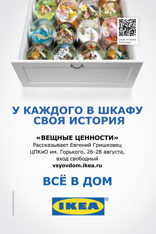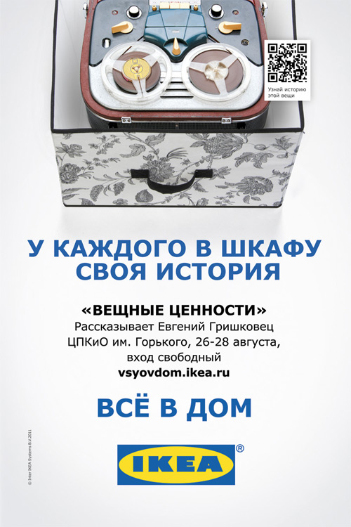 Главным слоганом IKEA на будущий год станет «Всё в дом!»В августе выходит в свет очередной каталог ИКЕА - уже 61-ый по счету. С выпуском каталога в России начнется и новая коммуникационная кампания - весь следующий год пройдет под эгидой ее слогана: "Всё в дом!". Уже 8 августа в Москве появится наружная реклама, анонсирующая предстоящее мероприятие "Вещные ценности", посвященное выходу нового каталога ИКЕА. Главный акцент в новом каталоге сделан на актуальной для нашей страны проблеме, - как создать на небольшой площади комфортные условия для жизни? Компания ИКЕА утверждает, что для ее решения просто нужно мыслить нестандартно. Достаточно воплотить несколько доступных идей из нового каталога, и в Вашем доме откроются неведомые ранее просторы. Наблюдая за российским рынком много лет, компания сделала вывод, что многие россияне не любят расставаться с вещами. Некоторые предметы, будь то игрушки давно выросших детей или смешная шляпа из заграничной поездки, бережно хранятся в шкафах, хоть и никогда не используются. С учетом того, что люди в нашей стране часто живут на маленькой площади большими семьями, и у каждого есть свои дорогие сердцу вещи, такая бережливость часто оборачивается хроническим беспорядком в доме. По наблюдениям ИКЕА, бережливым людям свойственно хранить ненужные вещи "на всякий случай"; коллекционировать; хранить то, что вызывает приятные воспоминания и, наконец, активно расширять свой диапазон увлечений, приобретая все новые и новые предметы. Соответственно, вопрос хранения таких сокровищ стоит очень остро. Эти наблюдения стали основой для новой коммуникационной кампании ИКЕА, эмоциональной, понятной и близкой всем, несмотря на то, что направлена она на продвижение функциональных и рациональных решений. "Мы всегда стараемся быть ближе ко многим людям, к их повседневным потребностям и условиям, в которых они живут. Именно поэтому наша новая концепция "Всё в дом!" и новый каталог разработаны с учетом особенностей проживания и характера наших российских покупателей. Мы в ИКЕА по себе знаем, что у любого человека найдутся свои "вещные ценности", с которыми порой очень сложно расстаться. Мы уверены, что идея нашей новой кампании и ее воплощение понравятся нашим покупателям", - говорит Ульф Смедберг, менеджер / директор по маркетингу ИКЕА Россия. Каталог ИКЕА 2012 года наглядно иллюстрирует способы использования каждого сантиметра ограниченной площади. Создавая тысячи решений для удобного хранения, ИКЕА поддерживает стремление сохранить все дорогие сердцу вещи, а также создать пространство для новых. Главным событием кампании "Всё в дом!" станет массовое мероприятие "Вещные ценности", посвященное выходу каталога ИКЕА. С 26 по 28 августа в ЦПКиО им. Горького в Москве взрослые и дети могут принять участие в мастер-классах и конкурсах, а также услышать истории актера и писателя Евгения Гришковца о близких его сердцу вещах. 8 августа эти же истории появятся на билбордах Москвы. Коммуникационная кампания задействует как стандартные, так и нестандартные форматы. Впервые компания ИКЕА будет использовать новый для себя инструмент - QR-код: двухмерный штрих-код, предоставляющий информацию для быстрого распознавания с помощью камеры мобильного телефона. Считав QR-код, пользователи смогут перейти на мобильный промо-сайт ИКЕА и узн