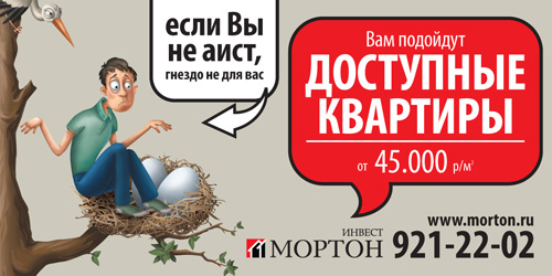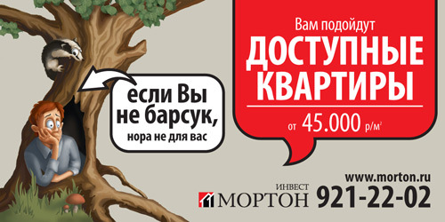«Мортон» призвала своих клиентов не быть барсуками и аистамиРекламная кампания девелопера снова делает акцент на стоимости жильяКомпания "Мортон", занимающаяся строительством и продажей жилья в ближайшем Подмосковье, продолжает рекламировать свое ценовое предложение. Основная идея рекламной кампании - привлечение внимания к доступности новостроек, стоимость квартир в которых составляет от 45 000 рублей за квадратный метр. Рекламная кампания проходит под слоганами "Если вы не аист, гнездо не для вас" и "если вы не барсук, нора не для вас" проходит в наружной рекламе. Разработкой креатива и размещением щитов занималось агентство "Медиа-шторм". В рамках кампании используется 250-300 поверхностей, она проходит в Москве и ближнем Подмосковье. Предыдущая рекламная кампания, которая рассказывала о том же самом ценовом предложении, проходила под слоганом "доступные квартиры. убойное предложение".