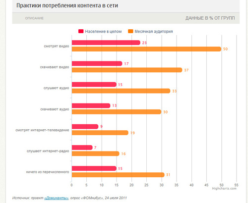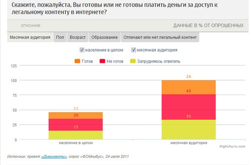 Четверть россиян не отличает пиратский контент от легальногоЕще меньше интернет-пользователей готовы платить за информацию в сетиФонд общественного мнения (ФОМ) и журнал "Интернет в цифрах" проанализировали отношение российских интернет-пользователей к легальному и пиратскому контенту в сети. Выяснилось, что 26% россиян не могут отличить легальный контент от нелегального, для 14% это не составляет труда, еще 7% затруднились с ответом. Потребление медиаконтента в интернете является широко распространенной практикой, говорят социологи. Около 37 миллионов человек (69% интернет-аудитории) просматривали, прослушивали или скачивали аудио и видео. Среди месячной аудитории 41% встречали предупреждение об авторских правах, среди населения в целом - 19%. Чаще других с ним сталкивались мужчины (46%), а также 18-35-летние пользователи (52%). Что касается легального и пиратского контента, то среди людей 18-35 лет и представителей сильного пола доля способных отличить один тип контента от другого выше средней на 8 и 7 п.п. соответственно. Исследователи отмечают, что для большинства пользователей неочевидны различия между "хорошим" и "плохим" контентом. Кроме того, данная проблема весьма далека от них. Это может быть связано с размытостью понятия "легального" в интернете и отсутствием четких критериев отличия. Например, 27% пользователей опознают легальный контент по его хорошему качеству, 24% - по его платности и 9% - по необходимости регистрации. Всего 11% россиян готовы реально платить за просмотр или скачивание информации (среди месячной аудитории - 24%). Абсолютная цифра составляет 13 миллионов человек, что достаточно для создания масштабного рынка платного контента. Социологи также отмечают: из тех, кто может отличить легальный контент от нелегального, 36% готовы "помочь рублем" правообладателю. Заплатив деньги, пользователи хотят получить качественный контент или соблюсти этику. Так, 29% пользователей готовы платить за высокое качество, еще 20% - за надежность и безопасность. Уважение к труду автора и закону отметили 11% и 9% пользователей соответственно. Главным барьером для потребления платного легального контента в интернете оказывается финансовый аспект. 40% пользователей ссылаются на отсутствие материальной возможности / дороговизну контента. Среди тех, кто не хочет тратить деньги, 13% заявило: все необходимое можно получить и бесплатно. По мнению еще 9%, достаточно их затрат на доступ к интернету. Инфорграфика с fom.ru |